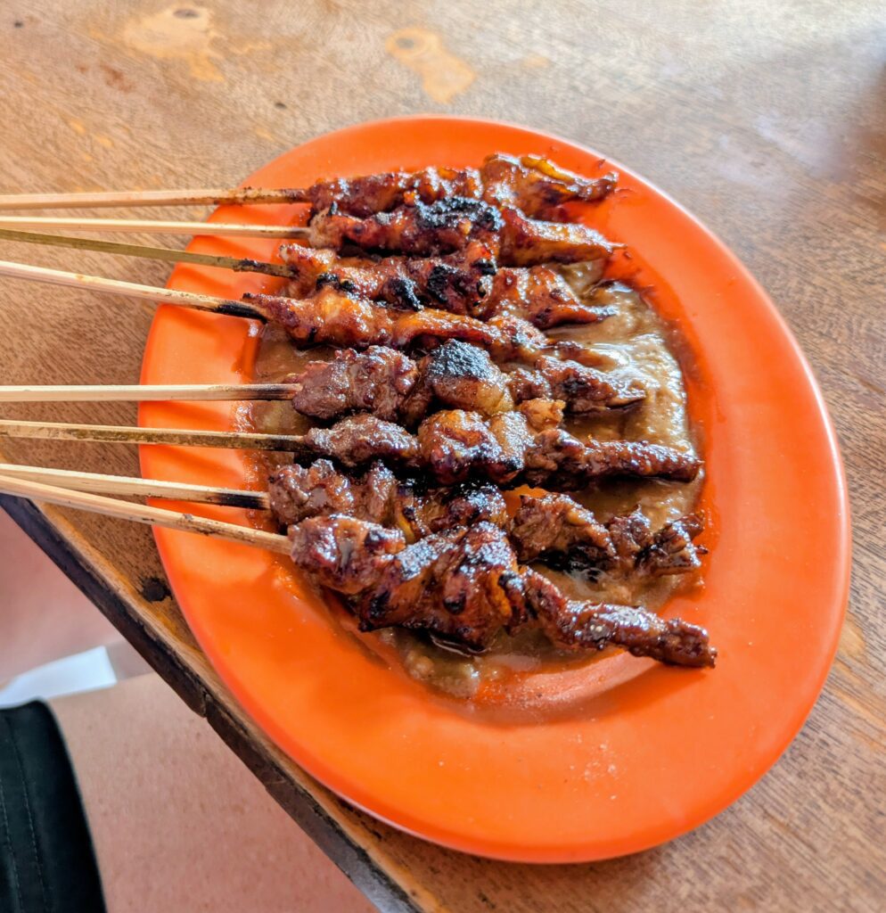 We went out for food. At the first place, Warung Sate Ni’mat Muslim, we shared Sate- X4 skewers of chicken and X4 of lamb with two teas. They were very small skewers, but very good. He cooked them right at the street over charcoal. The bill came to 34,000 IDR, or $2.05! We went to a second place, Depot Gimbo BBQ. We shared 1/4 kilo of ribs and rice. Jeff had a large Bintang beer and I had carbonated tea. This came to 156,000 IDR, or $9.42. With that we were full and walked back to our day stay place. I napped, Jeff relaxed. We readied, I blogged some, Jeff read and resorted our stuff for the flight. We checked out at 1930. By 1940, we were at a very busy gas station to top off the car. Jeff noticed our odometer reading was 978.5 km. Almost half of the amount that we drove in Thailand. It rolled to 980 once we arrived at the airport. The car rental guy met us straight up at 2000. He checked the car and told Jeff he would get the refund of 1,000,000 IDR, or $60.37. We thanked him and went into the airport. We got checked in and checked our bags by 2015. I passed through immigration, but Jeff had to go to a security person and get stamped. We had forgotten or else he would have done this to begin with. It all worked out as we were still two hours until our flight. We went into a lounge, and got snacks and water. They don’t serve alcohol here. I blogged and Jeff read.