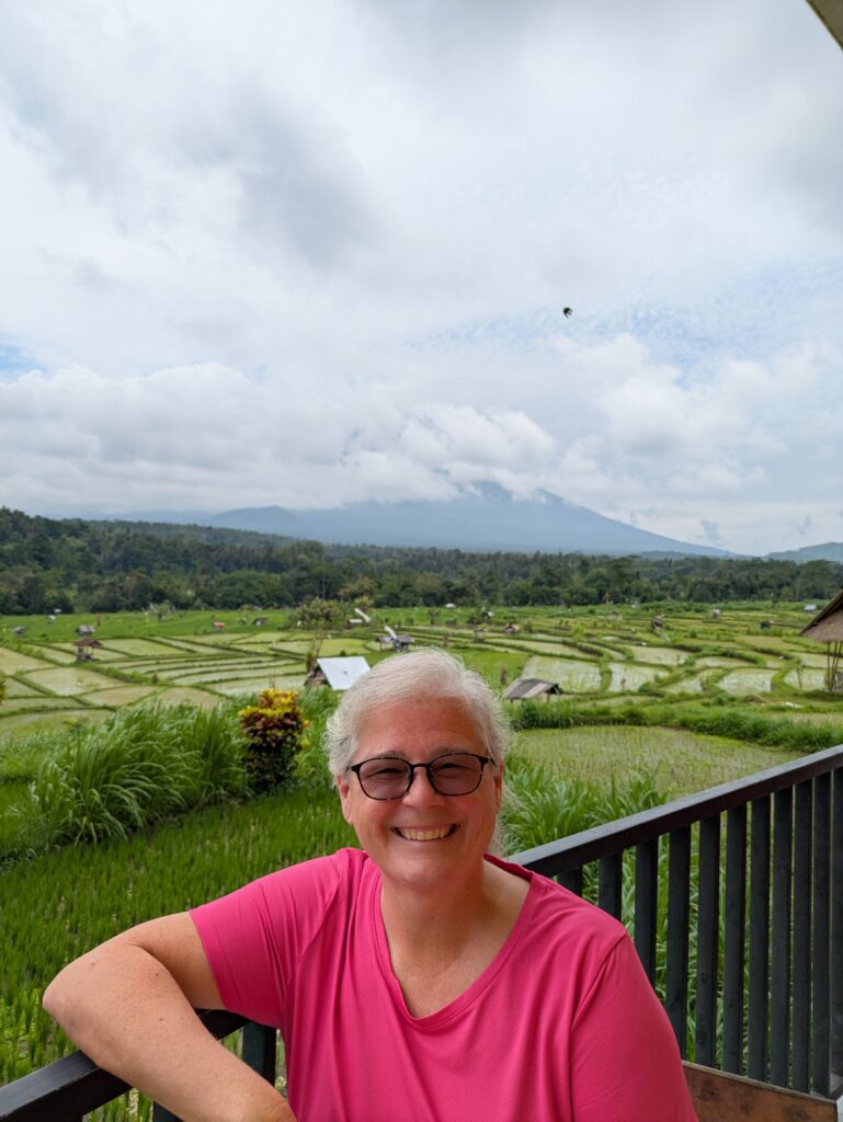 We both slept in for us… Jeff awoke 0620, and me 0740! There is not any call to prayer that we can hear, thankfully! There are lots of roosters, but they don’t seem to bother us.Anyway we had our Javas. The volcano is shrouded with clouds this morning, and most of the sky is white from other clouds. Humph! We went to breakfast. The person serving us is a young lady – yesterday was a young man. Anyway, she offered about the same food, but she did say sunny-side-up eggs, instead of just fried. So I went with that, and Jeff had scrambled eggs. Jeff had brought our PB & Nutella, choosing that over the jams offered. When we finished, I told the staff lady that they could clean our room today.