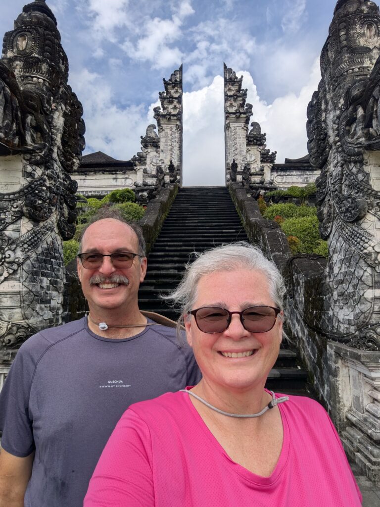 We loaded up and continued on. We saw celebrations at a couple of temples, and maybe a wake at one place. Everyone is dressed up nicely: women in lace blouses and sarongs, and men in mostly all white sarong- type outfits. It was refreshing to see the local custom dress. The small roads have been mostly just scooters zipping past or sometimes around us. Our vehicle has a strange self-shifting mechanism that seems to stall out a bit when we start to ascend some climbs. Jeff has gotten – kind of – used to it; but definitely does not care for it. When it does kick in you can be thrown back in your seat some! Anyway, we arrived at our last stop, Penataran Agung Lempuyang Temple, aka, Heaven Gate Temple. It is very crowded!