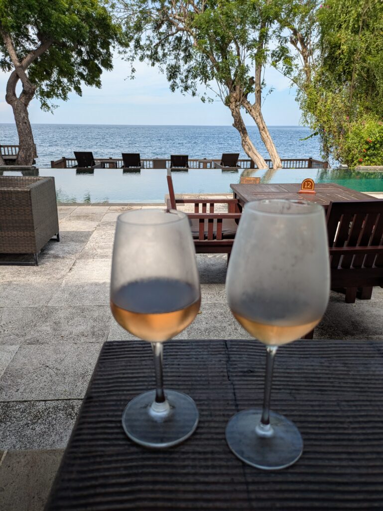 When we finished, we went back to our Lunar Bamboo Villa, and got in the pool. The afternoon turned to evening. I blogged, Jeff read and we had a snack French supper- cheese, bread, and Balinese red wine, called Sababay.