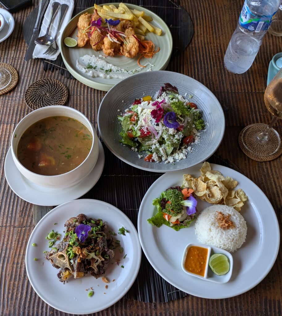 We left and drove back on the bigger roads and stopped at Mimpi Resort and Restaurant. Our hostess had recommended this place also. It is right on the ocean. We were the only ones in the restaurant but it was 1400. We ordered a Feta Greek Salad; Sop Buntut, which is a ‘Javanese-style Australian oxtail soup stewed with hearty vegetables, served with homemade pickles, sambal, emping crackers (which is an Indonesian cracker made of melinjo or belinjo nuts) and steamed rice’ – and a plate of three grilled oxtail pieces; and a Fish and Chips plate. The whole meal was Super-Good! We split a small 175ml carafe of a rose wine. The meal came to 490,000 IDR, which is $29.34.