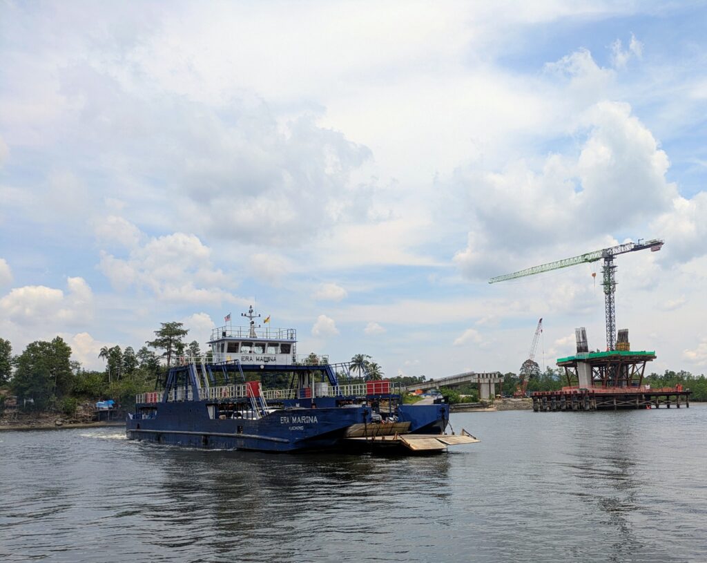 We stopped in Lundu and topped up the car for 47.05 RM in gas, or $11.14. Both cars have had good gas mileage. We took the lesser road back to Kuching. It is not in as good of shape, but we persevered, as it was a change in scenery, a little bit. We unfortunately saw more palm tree plantations that interfere with wildlife habitat. We did cross a river… on a car ferry that cost us a whole Ringgit fee or 24 cents! Our timing was spot on – we were the last to load!