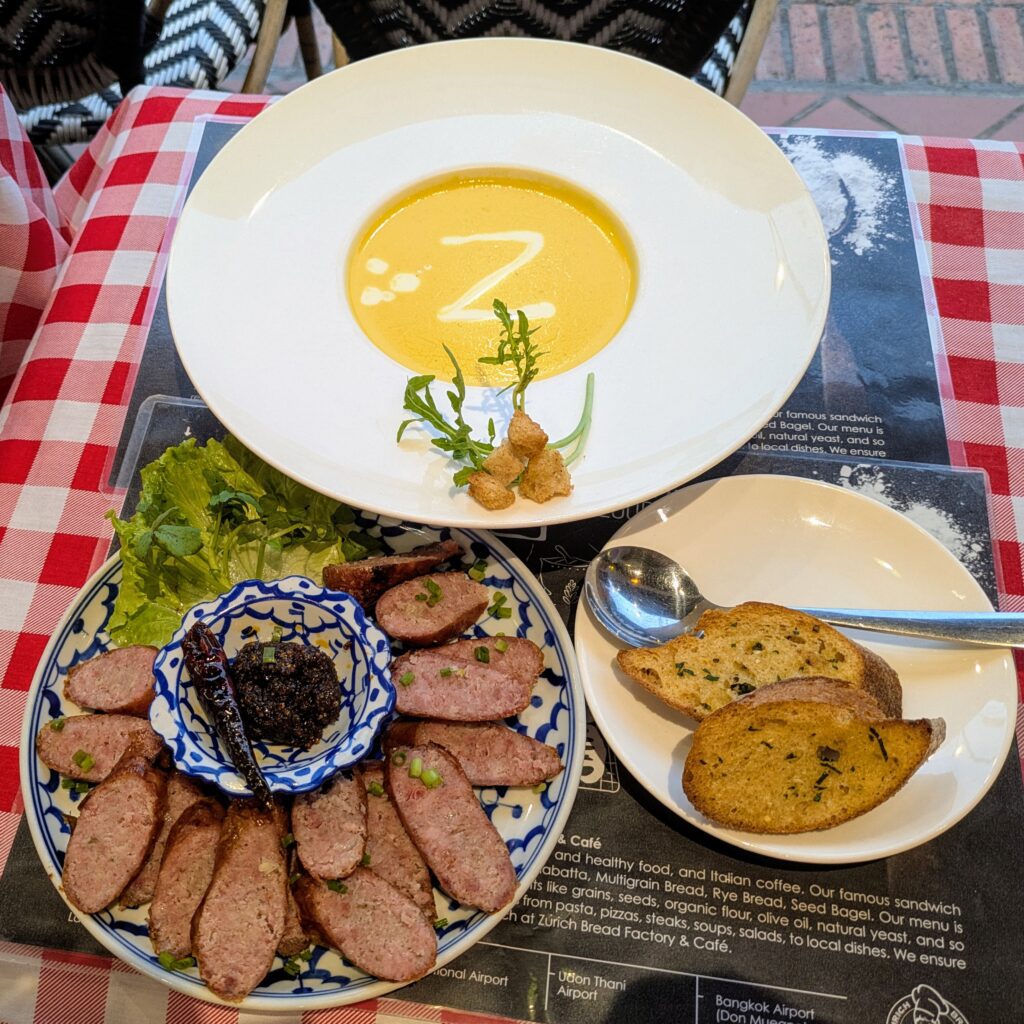 Back at our place we unloaded and cooled off. For lunch we ate a light bit: last of the peanuts and some mixed nuts. Then I blogged and Jeff read. We went back out to Zurich Bread Factory and Cafe for supper. We had pumpkin soup, watermelon feta salad, and Luang Prabang sausage, called Sai Au LBP. Our bill was 690,000 ($32). Tourist pricing!! I had a Very Berry smoothie and Jeff had a BeerLao. The evening was chill-axing!