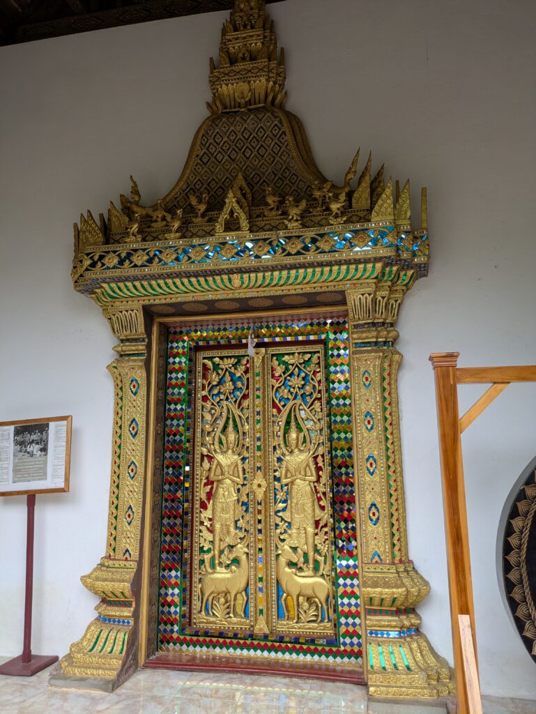 It seems crazy that this many people could live in this place. Jeff and I just could not imagine. It would have been so hot, especially at night. Later we saw another placard that limited the visitors to only 10 in the place(due to weight load?)… how scary that was to see. Another placard did show that the house had been restored in 2011, making me feel a little safer walking about.There were displays of elaborate dress that the family wore, Lao musical instruments, a headdress worn by female performers doing classical dances and lacquerware & textiles that they had. It was a fascinating home and nice to see Laotian heritage.