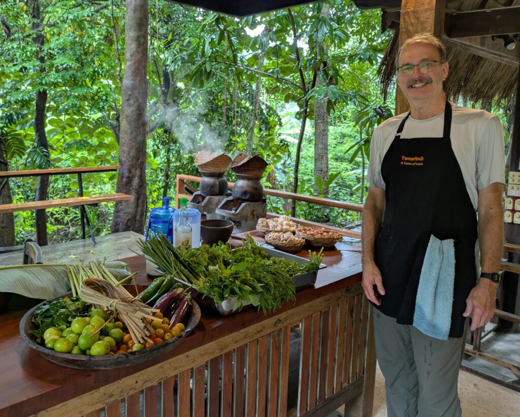 Then a man, Sit, introduced himself as our instructor/chef. At 0900, we loaded up into the back of a truck. At 0910, we arrived at the local market. Sit took us around to various umbrella stalls. It was still raining, so we were dodging the mud puddles as well as water overhead dripping from the tarps and umbrellas – in addition to the normal hustle and bustle of markets. You know, other shoppers, dogs, scooters, etc.😂🤣 He showed us local herbs and gave us a few to try: mint, Lao basil, dill. We saw many veggies. Then over to the meat section, after he warned us of the strong smells and that we were okay with this. Sit showed us local fermented fish being processed for a fish sauce, and let us smell it. We saw the whole parts of various animals – Laotians use the whole animal in cooking/eating. Sit even showed us bile and had us smell it. I’m not a fan of that smell – goes back to nursing days. Lastly, we went by a stall and tried some toasted, seasoned bamboo shoots. We like these, having tried them at Tamarind Restaurant when we had eaten there.