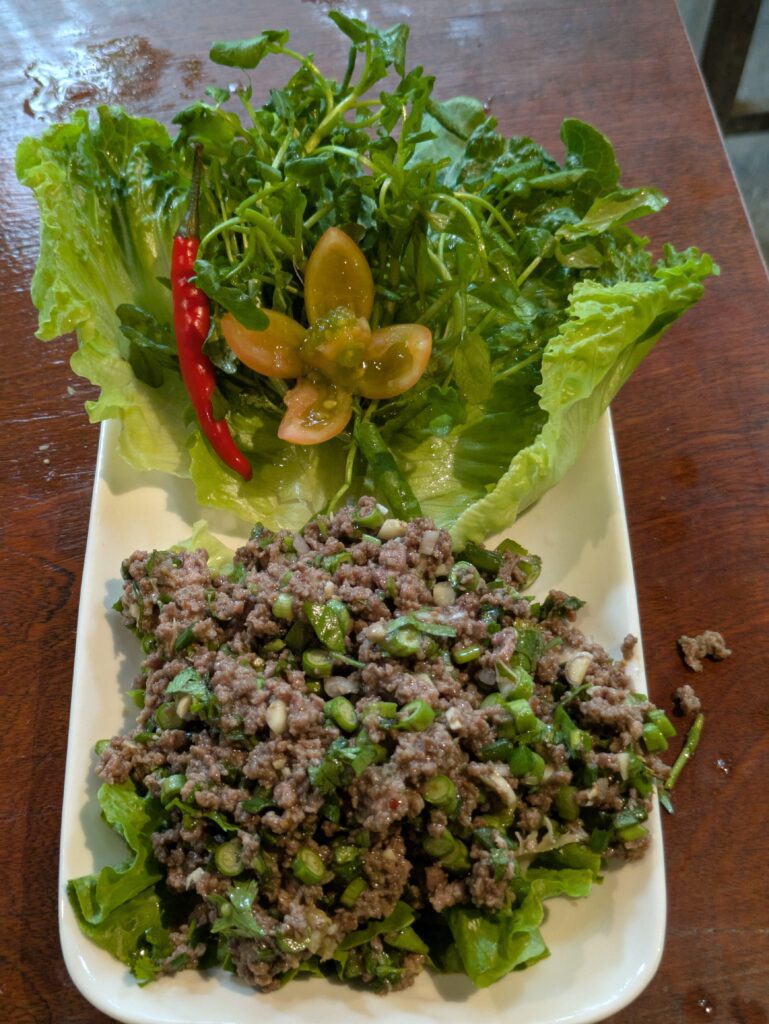 This was done for us, as we made our next dish: Koy or Laab- Minced meat and Herb Salad. Sit had us making it with Buffalo. We pounded our herbs, and veg for this and then browned our meat adding it to those herbs. We then scooped it onto a lettuce, veg tray.