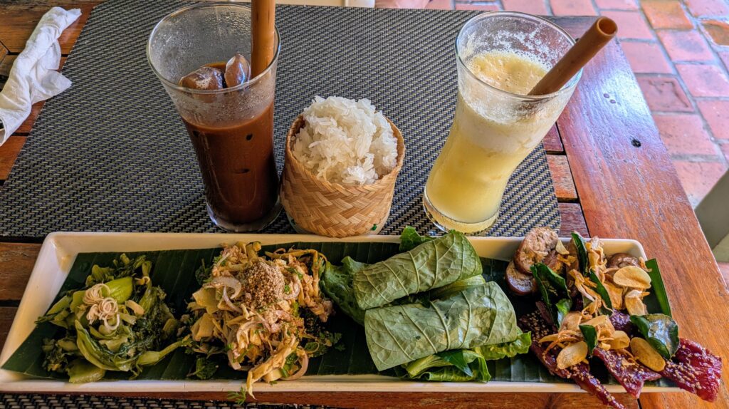 The day was rainy, drizzly most of the whole day. So we read, watched YouTube and lazed away the morning/afternoon. We had a break in the rain and went out for lunch at Tamarind Restaurant. We had a Taster Plate called Five Bites. 1- Sai Oua, which is Luang Parbang Sausage; 2- Som Pak Gat, a Leafy Green Veg. Pickle; 3- Sinh Savanh, ‘Heavenly’ Dried Buffalo; 4- Sa Mak Keua, a Salad of Minced Pork, Eggplant, Banana Blossom, Bamboo, and Sesame Seeds; and 5- Miang Kham, Lettuce Wraps of Noodles w/ Paste, Nuts and Herbs. It was very unique and a great sampler of Laotian food. Jeff had a Pineapple and Ginger Crush smoothie and I had an Iced Lao Coffee. The total we paid was 300,000 LAK, which was $13.93. We went back to our place.
