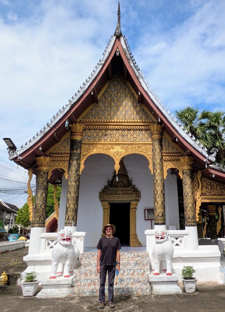I awoke and saw around seven monks lining up right in front of our place. Every morning they do a ritual walk. According to a brochure that was in our place – it’s called Sai Bat (Alms giving). It was raining, so we will not watch it today. But I noticed the monks lining up here were so young. In training?… I have lots of questions? Anyway, we finally got up & about, around 0700. My coffee stash was getting low so we went out. There are many local shops selling their own local brands. We stopped at Crazy T Cafe so I could try theirs. I got it as a take away. As we were leaving, we saw a man making what seemed to be coconut pancakes. So we bought one of them for 30,000 LAK, which was $1.39. We went back to our place for breakfast. My coffee was alright, but not what I want every morning. But the Coconut Pancake, well, that was awesome! It was very densely packed, mostly with freshly shaved coconut. We split it and had our yogurts. It was enough – we were satisfied and full!