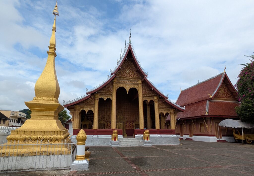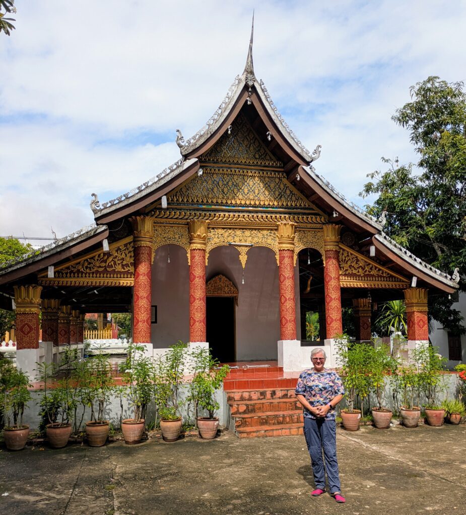 Then the day cleared, some blue sky and a peek-abo sun. So we went out – going to 3 Wats, or “Vats” as the signage here calls them. The first and closest one to us – Vat Sop Sick Haram – is not listed in the brochure we have. It seemed to have three main temples: one had a large sitting Buddha- when we entered here some boys in training (I think) to be monks scattered out; the second had many smaller Buddhas lined up in an altar fashion; and the third had one larger Buddha surrounded by many smaller ones. Now we moved on to the second vat- Vat Sen Souk Haram. This was in our brochure – the name translates to “Temple of a 100,000 treasures”. There was a side temple that houses a large standing Buddha, which can be seen from the main street out front. Also another side building had a large Buddha footprint. The main temple of this vat was closed. Our last and third vat- Vat Nong Sik Houn Muang. It is not in our brochure. The main temple here was also closed but it had the Naga balustrade daring one to go in. A side building housed a very worn, well-used drum. One of the culprits waking us up in the wee hours of morning!😂🤣