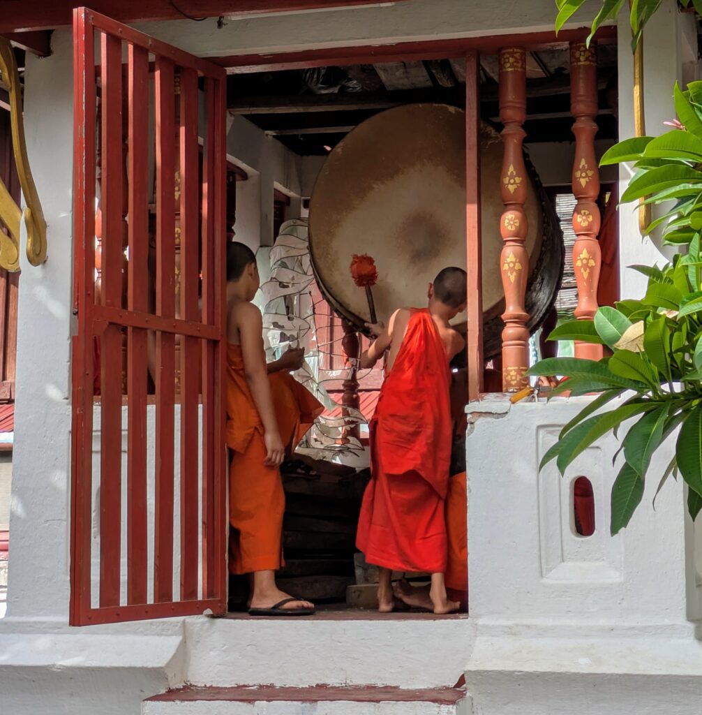 Back at our place we ate the tart and had adult beverages – me an Apple Somersby and Jeff a BeerLao. I blogged, Jeff read. Afternoon gave way to early evening. At 1600, we heard the drum and cymbal at the Wat right across the street from us, we went and checked it out. Don’t know why they are drumming so long – lasted around 20 minutes like this morning. It’s not a Buddhist holiday that we can find. As always… Questions???