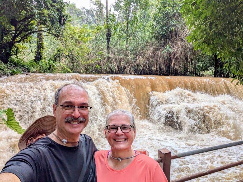 We arrived and paid 60,000 Kip each which included an electric car shuttle to and from the car park. Where we were let out was a sort of shopping stall area that fed into a sort of zoo! They had Moon Bears that were rescued from illegal wildlife trading… interesting, but fun to watch. We made it through and found the path to the waterfall… WOWZA, you could here the power before you saw them. There was so much water surging down the rocks that the spray ricocheted all around. Some of the viewing platforms were underwater, as well as flooding in the normal pools where you can swim! But not swimming now!! Many ‘No Swimming’ signs were posted all over. So we got our pics and left. It was awesome, though.