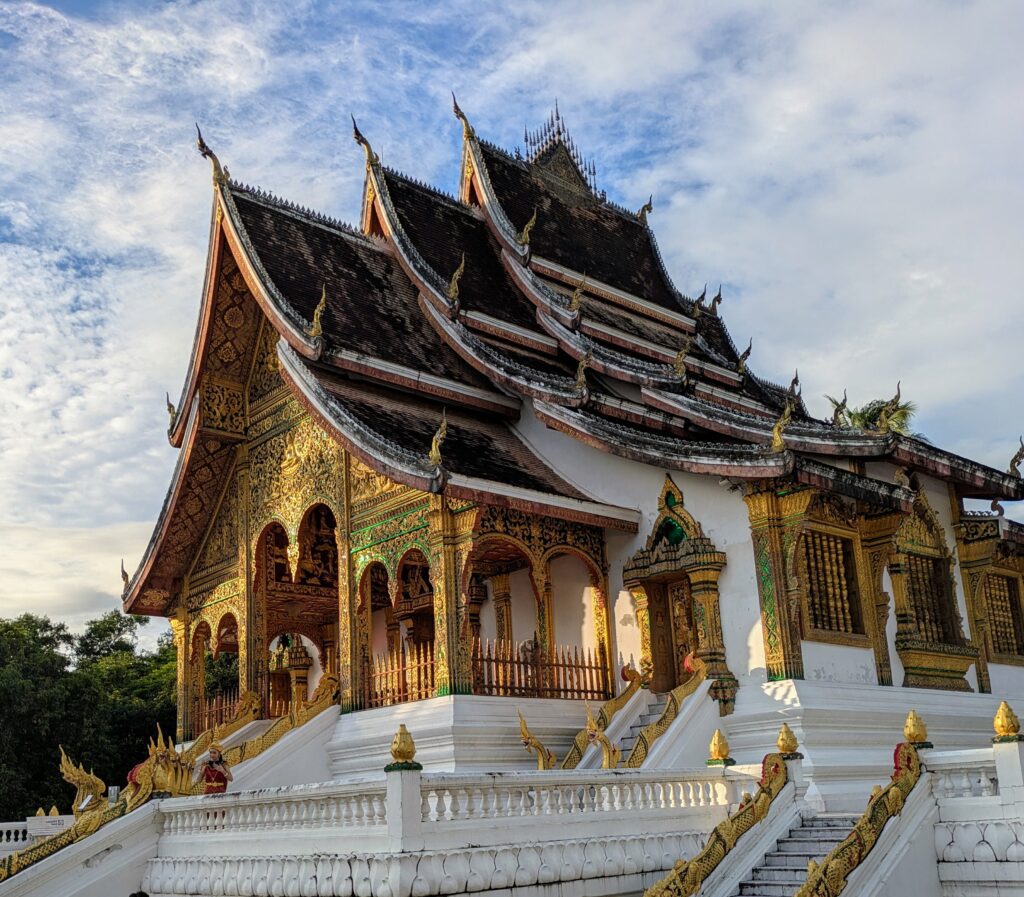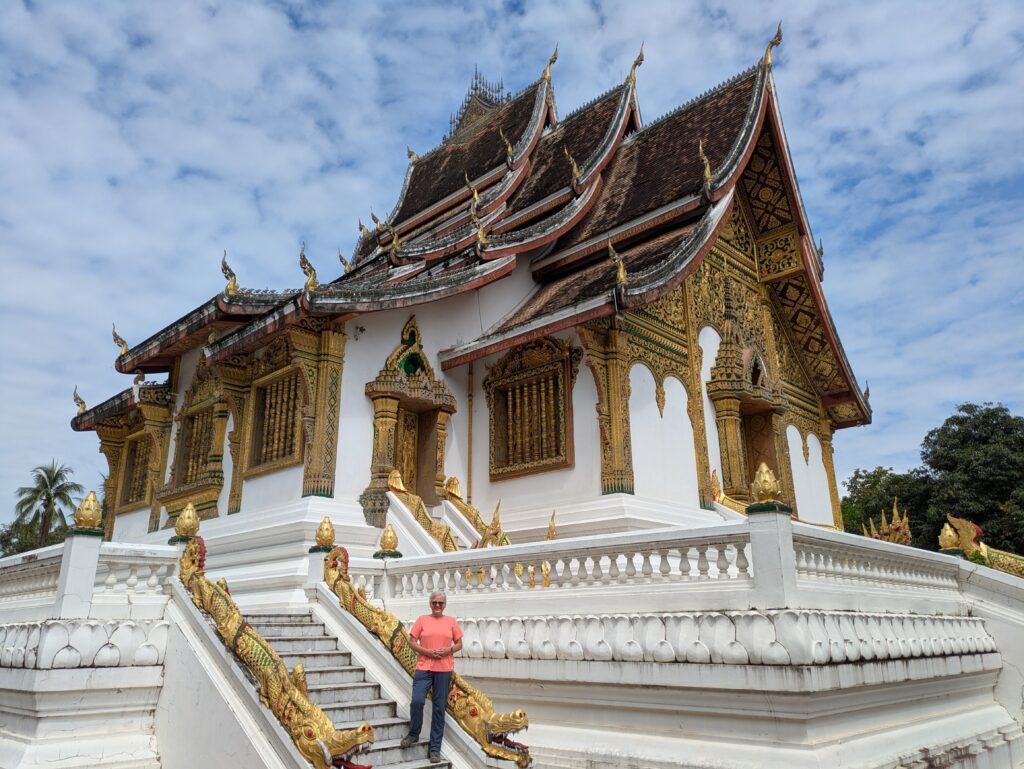 Our first stop was the Luang Prabang National Museum & Royal Palace. It is described as a “local-history museum in a stately former King’s mansion with gardens & ornate architectural accents.” We arrived around 1000 and paid 60,000 LAK ($2.78) each. The sun was shining!! A blessing right there! Anyway, we walked around the Phra Bang Hall & History of Prabang building. It is gorgeous in this sunshine. This was a beautiful Wat: all gold guild with white contrasting walls outside; the Naga balustrades lining the entry up; and the amazing roof-line – multi-tiered and curving peaked tresses. Inside were many Buddha statues and more gold gilding. No pictures were allowed. We exited and then went to the museum/ Royal Palace. Again no pictures were allowed inside! Bummer! It was just as described, a museum of Laos and was the living quarters of King Sisavang Vong, the last King of Lao Kingdom of Luang Prabang and the founding King of the Kingdom of Laos. [Side – his son, Sisavang Vatthana was the second and last King of the Kingdom of Laos, forced to abdicate in 1975.] Anyway, there was lots of Laotian artifacts- pottery, religious idols, and gifts given to the King. Some of the rooms were set up how they were when the building was the Royal Palace. There were beautifully designed walls and gorgeous, massive pieces of furniture. The whole complex was well worth the entry fee!