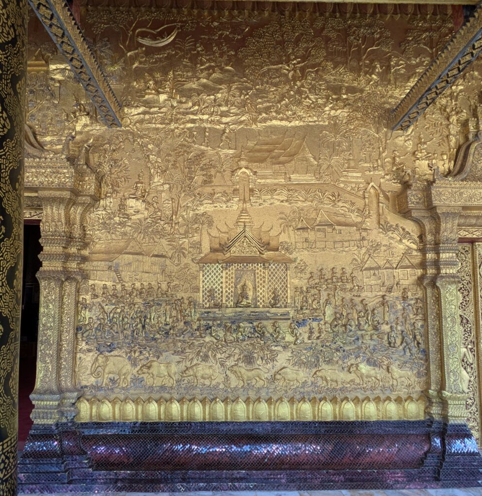 Next we went to Wat May Souvannapoumaram. This wat has the same interesting staggered roofline with a relief gold gilded entry. Jeff paid the 20,000 LAK (93 cents) entry fee for each of us,. And we went into a very rich, red worship room with the surplus of Buddhas. One was Jade, I appreciate these the most as art pieces… it contrasts great with the gold. But the outside was the best! The gold-gilded, front facade was so 3-D and a picture of an ancient kingdom/time. I could have spent a while here looking at each person, animal, building and landscape…