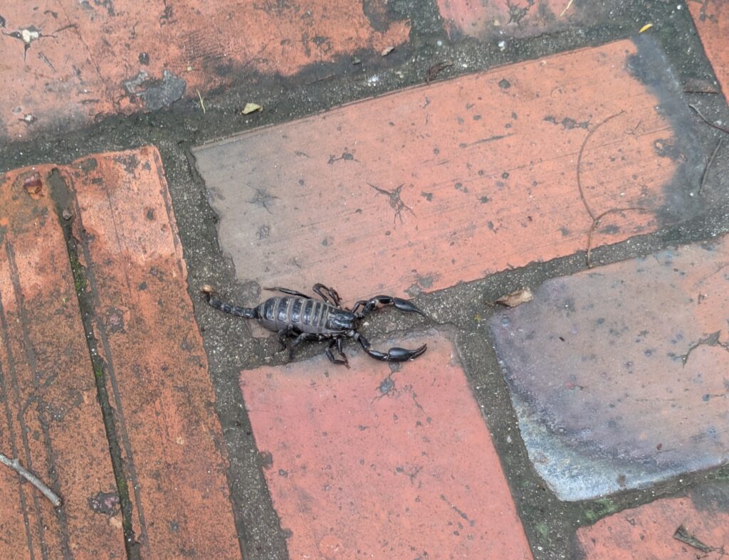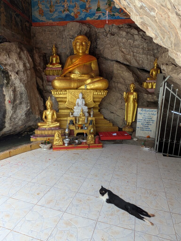 We moved on to our third stop, or rather hike! We went up Mount Phusi!! It is really just a hill. There is a stupa on top built in 1804. According to a placard… Lao folk story tells how this mountain was moved from Sri Lanka by the monkey king, Hauman… There are “traditional storytelling” venues around here, which this is obviously promoting. We paid the entry fee to go up – 30,000 LAK each, or $1.39, and did the over 300 steps up. Once up there were sweeping views of the Mekong and Nam Khan Rivers, that make the old part of Luang Prabang a peninsula. This is a great spot for sunrise and sunset, but both times are busy. We were here around noon, and not too many. The views were spectacular. Walking around there were differing Buddha statuary and a few small temples- one of which was set in a shallow cave enclosure. As I was taking off my shoes to go in a cat preceded me and splayed himself out on the cool marble… good idea, as it was getting toasty. We left and then saw a scorpion! He was meandering on the brick path. Time to head down! Just kidding! (LOL) We did finish up here, doing our own meandering. We exited down through another wat that is under renovation. Not much to say about it.