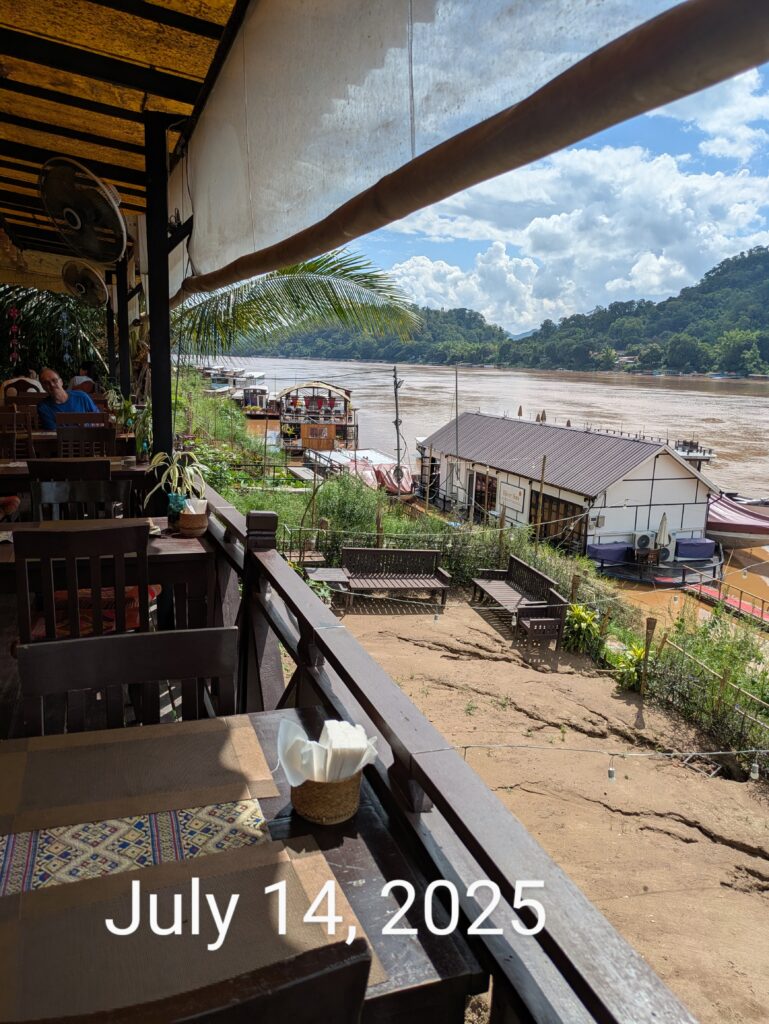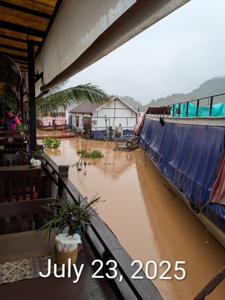 A Laotian man staying here, mentioned to us that his family from Vientiane was supposed to have come on the train today, but it was canceled. We asked if it was due to the rain, but he said it was due to Typhoon Wipha that hit Vietnam. He also said that there are landslides, and the rivers are up. It’s still raining, alternating from light & misty to rain showers. But at least it’s not buckets… right now, anyway. We went back to our room and Jeff noticed a flood warning in Luang Prabang! When the rain had let up enough – around 1000 – we went out to see the Mekong River. We could see it seemed swollen, but wanted to get where we had walked a lot to compare.