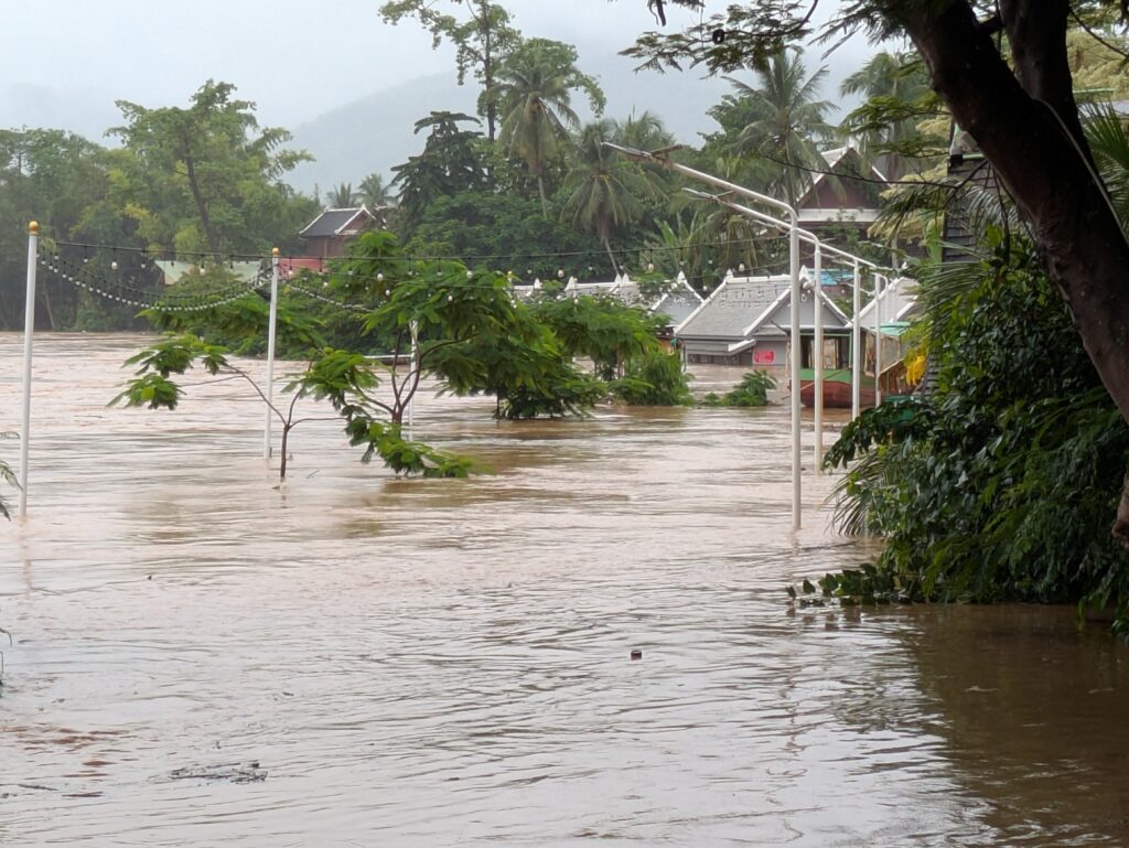 We stopped at a local convenience shop, getting couple of things. Then we walked back to our place, just in awe at Mother Nature, and figure the rain is probably still fall out from the typhoon. But we were pressing our luck, and went straight back. Once back we researched and checked out the stats: The Mekong is up 4.82m, which is 15 feet 10 inches!!!!! Absolutely and positively incredible! (We could not find stats on the Nam Khan River.) We were wrapping our heads around this. It is hard to image, but we saw it with own eyes, and that definitely makes it more real! No doubting Thomas’s here!