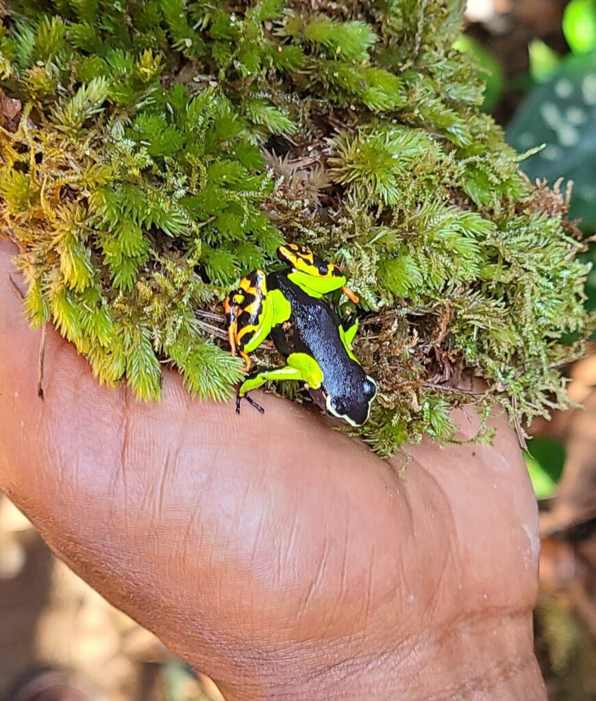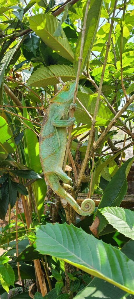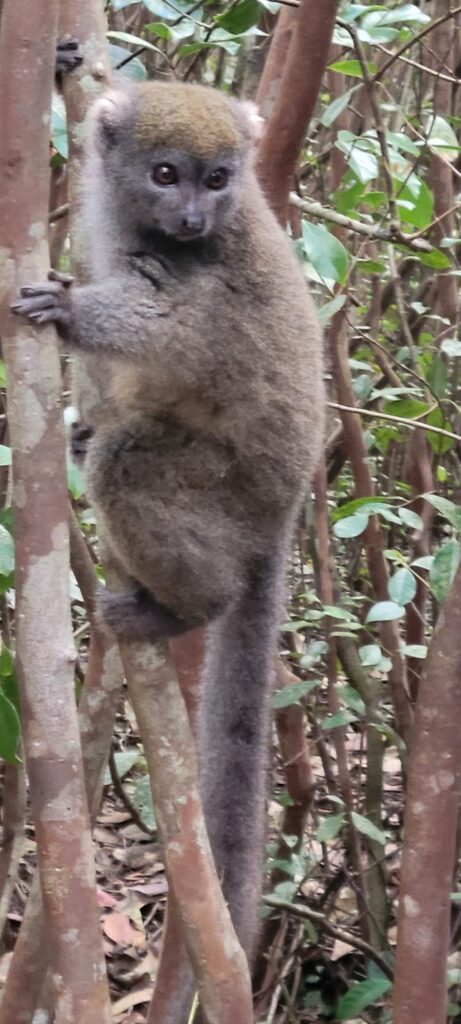 Our first stop is at Peyreiras Reserve at Marovezo. It was a private run place – so more zoo-like. Our guide, Franklin, first lead us to Lemurs after he collected some loquat out of a tree. They are not in cages but they are handfed, and allowed us to “pet” them. We saw two kinds: a ,that is brown and white; and the Brown Lemur. We each were able to feed one and stroke their backs. They are obviously used to humans, but still startle easily. Then we went in and out of pens: showing us many chameleons – I think he said they had 35 in one pen. What I remember was a Panther Chameleon; and a chameleon that has a horn -like snout. We probably saw a dozen of them, with a couple of them doing their crazy stepping walk. We also saw a couple of tomato frogs – they are red, and about the size of an egg. Then we saw a birght orange frog – size of thumb nail, and a black frog with neon green spots on it’s body and it’s legs black and orange striped – also thumb nail size. None of the frogs are poisonous, but sure seems like they should be!!! Next we saw the two boa constrictors – a ground one and a tree dwelling one, also THANKFULLY, in pens. Lastly saw a really large leaf gecko, and a much smaller leaf chameleon. We left there with a good feeling, even though it was an upscale zoo, it still reminds you of the wildness of Madagascar, but much habitat areas are being lost.