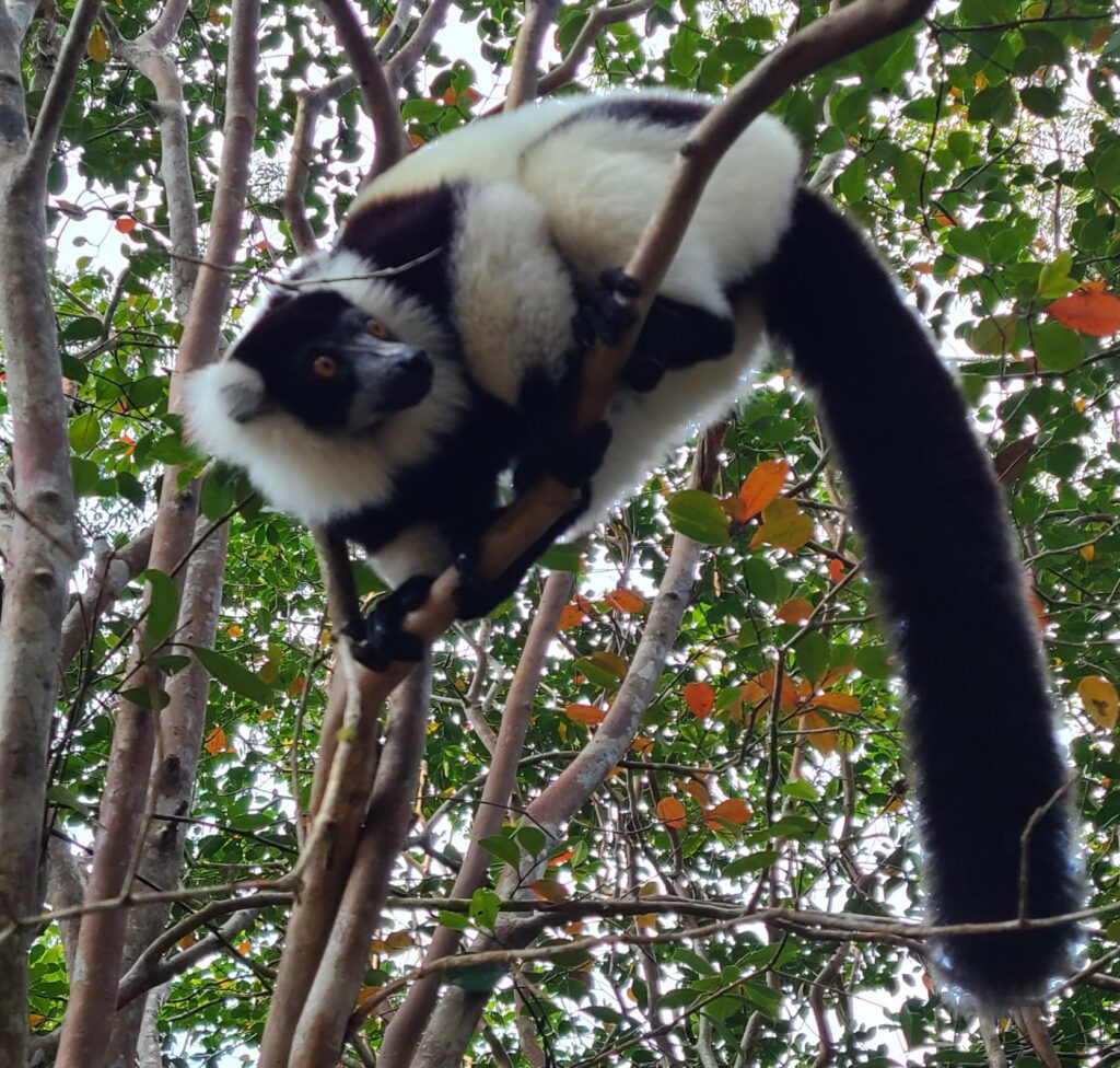 We drove on to Andasibe and to another private reserve- Vakona. The reserve has two parts. The first part is going to the Lemur Island. We meet our guide, Sophie, and immediately board a canoe! We travel a whole 25 feet in the canoe, but we arrive to Lemur Island! Sophie decribes these groups of lemurs as once being pets of people. Right off we see some Brown Lemurs, one of which has a two week old baby clinging/wrapped around her belly. Sophie has fruit and attracts them to us with it. We actually get to hand feed them as well. We had to present the food in our flat hand and they somtimes grab your hand then use the other to take the offering, or they just grab the food with their mouth and move away. Next we see the Black and White Ruffed Lemurs. These have longer white whiskers – where ruffed comes from. These lemurs are bigger than the brown ones. Then we walked a bit more and the Brown Lemurs followed us, especailly the mother one – she’s feeding two after all. Now we see our third lemur, the Bamboo Lemur. There were two, and these are the smallest lemurs here. The Brown Lemurs kept getting in the way so the Bamboo Lemurs backed down – they finally did get some fruit, though. Next we come to another Island, but we can only look over to it – we are not allowed on it. A Sifaka is sitting right there to greet us. Sophie throws some fruit over to it. But the lemur does not budge. Our guide, he says, “They are lazy.” He throws another piece of food. The Sifaka finally does his thing – he gets up on his hind legs and moves sideways to the fruit, hence the name given them. They are called the “Dancing Lemurs”. Sifakas are the only ones who move using just their legs, upright. But it is very unusual to see them strutting, or dancing, or leaping sideways. They are fast and effiecent, though. All the commotion bought out the fifth and last lemur we will see – the Red Ruffed Lemur. The two ruffed and the Sifaka are larger, all about the same sizes. The Red Ruffed ended up eating the other food (that the ”dancer” missed). We also saw a couple of Brown Lemurs. Sophie said they mix the two groups of browns, so that inbreeding is not a problem. He also said the red and black&white are kept seperate because they can cross breed, but the offspring is sterile. The reason this works is they don’t get in water. Anyway, we caught our canoe back to the “mainland”. Thanked our guide and back in our vehicle.