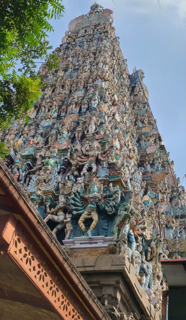 So at 1030, we boarded tuk-tuk and went to the main Hindu temple here, Meenakshi Amman Temple. No tuk-tuks are allowed past a certain point, so he dropped us off as close as possible . We walked about 1/2 block and the temple square opened up with the huge, multi-colored vimanas. These seemed more intricate because the painted gods popped out visually. These vimana are superstructures, and quite something to behold. We walked a third of the way around it and then went back to enter at the East gate. First, we had to check our shoes (which we are familiar with), but we also had to check our bag and our cell phones! Inside is a big, four-sided hallway around central shrine area, with the large intricate pillars, and painted ceilings. But I couldn’t get any pictures, because, well, no cell phone. We just meandered and enjoyed! We did seem to be always walking against the flow of people- no matter which way we went!! A foreigner approached us and asked if we had seen the golden temple? Jeff knew what he was talking about and replied no. They conversed some and we found out we could go further inside, just certain shrine areas are off limits to non-hindu, and some shrines even to foreigners.