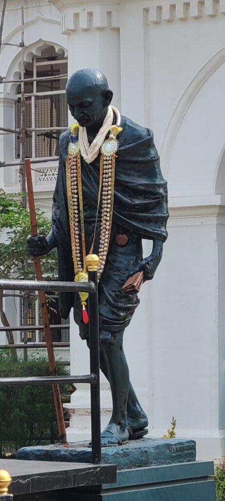 We awoke and readied. We set out for a big walkabout – 5.7km (3.5 miles). We are going to Gandhi Memorial Museum. Along the way we found a very local sit down place for breakfast. We actually shared a table with two young men. We thought we had ordered a dosa and an omelet (but we got two dosas and an omelet). They started us out with a banana leaf, and gave us dabs of coconut chutney, and tart lime chutney. Then brought the plain dosas. we had started eating when they brought us sambar in a little bowl. Then the omelet came with red onion and dusted in black pepper. Great breakfast and both meals, as in the total bill… only cost 75 rupees (95 cents)!!! So amazing.