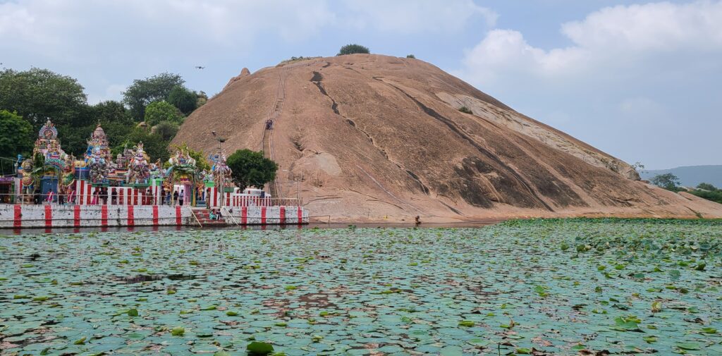 Back outside, Jeff ordered a ride on Ola (like Uber). A tuk-tuk responded and took us the 13 km (8 miles) to Samanar Jain Hills. When we arrived a festival was going on – don’t know what it was about, but we know a festival season starts tomorrow – Pongal. It was very loud music, and quite a few people. There is a Jain temple here at the foot of the stone hill with a body of water covered in lily pads. We bypassed through to go up onto the hill. On the hill there are 1st Century rock carvings. We made it! The carvings are in a line on an almost vertical wall, which may have helped preserve them. It was very windy and got too steep for me to go on up to the top. I turned around. Jeff went a bit further up, but turned around also. We were hiking back down and a group of boys wanted a selfie with us. We obliged. Then it turned into a selfie of just me with them. I don’t know why, Questions?? Finally down, Jeff ordered another ride to take us back.