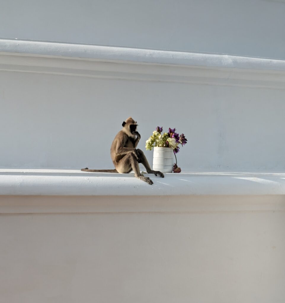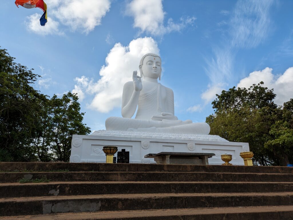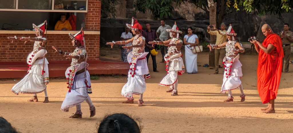 Now, we climbed quite a flight of stairs up to another landing/plain area and the main upkept area. This whole area is where most of the activity is and decorations are being done.1st place- a stupa, Ambasthala Dagaba, with pillars that no longer support a structure around the stupa. This is supposedly the traditional site where Mahinda and the King met. 2nd- a very large sitting Buddha statue. It was up on a rock cropping. We climbed up the steps to it. Great views of the surrounding area from here! 3rd- Maha Stupa, built by the King. We climbed up different steps to reach it. Once up, there is another, not as large, stupa right next to it, but it is so new(?) I have no information on it! Questions?? We walked around the stupas, taking in the great views and breezes here. We caught a cheeky monkey was ‘stealing/eating’ some offertory flowers. The 4th place- a high summit to overlook the Buddha statue and the “twin” stupas- we did not go up it as it was getting late; very cloudy-rain-like; and the way up seemed sketchy to me. As we climbed back to the landing/plain area, some dancers and drummers came out. We watched them with many locals. I don’t know what it was about, but was nice to see. We skipped out before they finished.