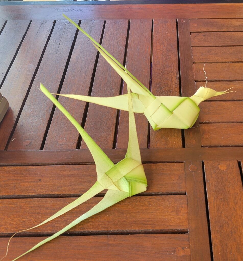 We unloaded and went to try for our free breakfast – it was just after 1130 when breakfast was to close. As we were going to restaurant, a lady gave Jeff and I each a reed origami fish and bird she had made. She’s a shop owner and tried yesterday to lure us into her shop. We took them, thanking her. It was a nice gesture – much appreciated. Arriving at the Blue Moon, the waiter guy saw us and let us order. We both got Disk Mashuni, which is a Naan with coconut (Disk) served with a tuna salad – tuna all small flaked with grated coconut; and bits of red onion, chilies, curry leaves, and salt. (It was one we had ordered yesterday, but I forgot to describe it.) This is so good, light and filling, and great seasoned taste. What a great day it has been, and it is still (just barely) morning!