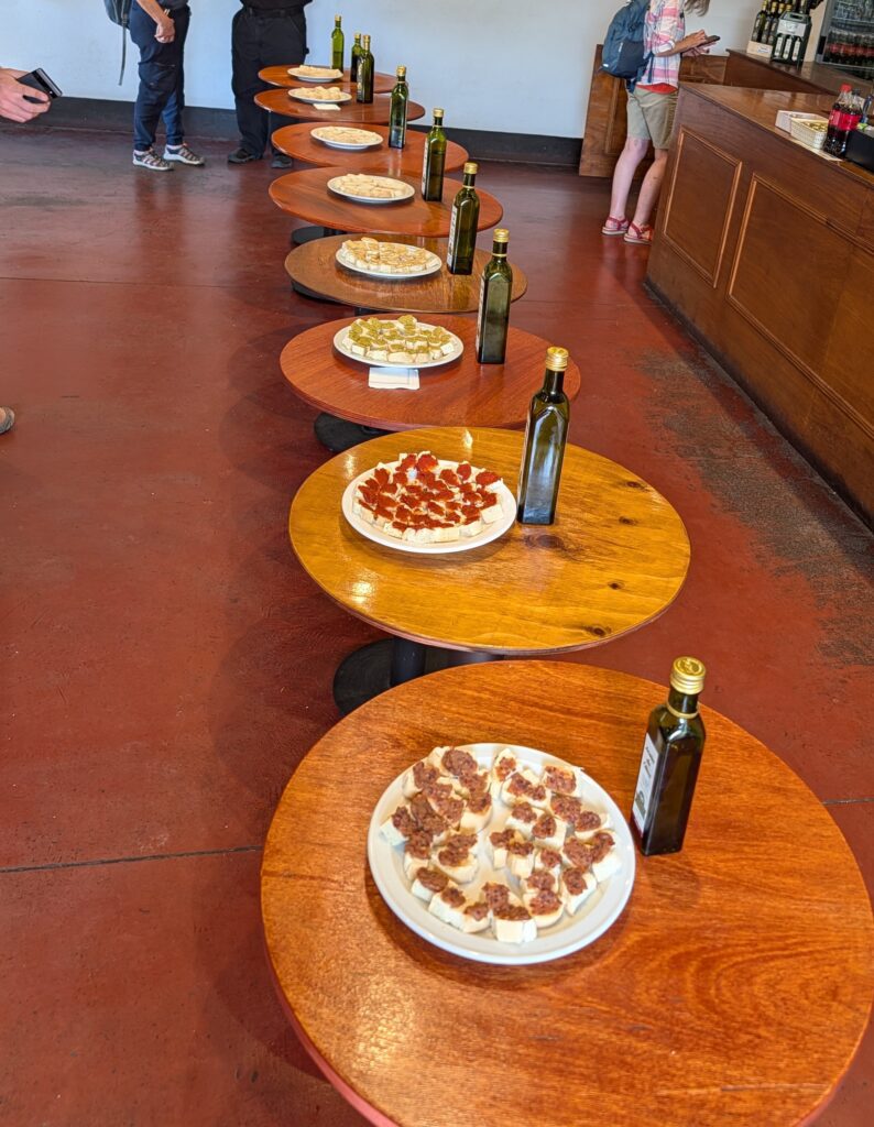 We all loaded up and moved on. Next stop was the Olive Oil place, PaSrai – the name was derived from the first three letters in Spanish for raisin, and the second three letters in English for raisin. Our guide, Andrea, said it takes 11 kg of olives to make one liter of oil. She also said you should only keep EVOO- Extra Virgin Olive Oil for six months once opened. We moved from the production area to the tasting area. But before the tasting she told us of different cosmetics and lotions made from olives, even offered us a sample of a couple of products. Then we tried several olive oils on bread, some breads had different spreads. We liked the picante(pepper) and garlic olive oils best. It was great EVOO, but we will be leaving soon and couldn’t justify carrying any. But we did buy a small bit of honey with walnuts and almonds (6,000 ARS/$4.17).