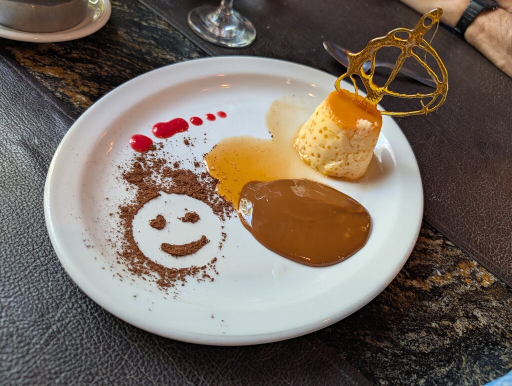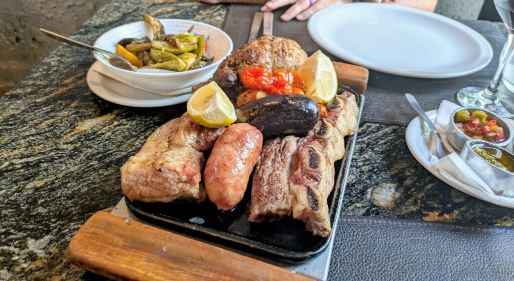 We went out for a late lunch, wanting more Parrilla(Argentine BBQ). The place we had in mind did not open until 1700…that would be 2.5 more hours. So we went back to Estancia La Pasion. It had been only three days ago, but well, it’s a great restaurant. We ordered Parrilla for two with sauteed veggies. We waited just over an hour for our food… The parrilla was for two, and it’s basically a platter of different, grilled meats: Beef rib, flank steak, gizzard, pork loin, pork belly, sausage/chorizo, and blood sausage. It was all seasoned well. I did not have any blood sausage- I’m not a fan at all. Jeff did not mind it- he said it was better than any he has had before. We shared a Zuccardi Q Malbec – the waiter had recommended it for our meal. It was all great, and worth the wait. We asked for the bill. The waiter came over and actually offered us a free dessert. We hesitantly agreed, as we were full. He came back with an overly decorated flan with a crystal caramel flourish accompanied by large spoons of caramel and honey, and a face with strawberry puree like a feather out of the cinnamon head. Strange to look at, but it was good. The bill was 80,800 CLP, $56.53. Wowza, what a deal! We walked back to our place and watched more Star Wars stories, while eating a snack of bread with avocado, and crackers.