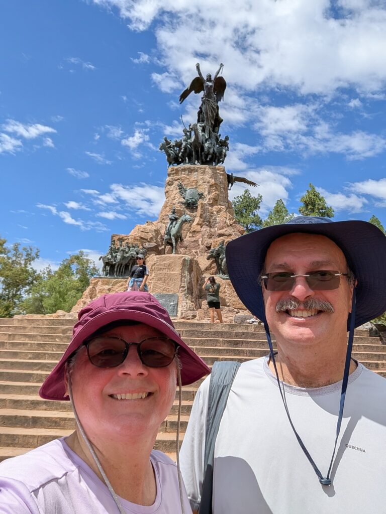 Anyway, then we saw the hill, Cerro de la Gloria. It is small in comparison to the Andes Mountains in the background, but it is the only one around here. Then we reached an “S” climb to the top. At some of the bends are signs telling how far we’ve gone up,… 15 m (49 ft); 45 m (147.6 ft); and then 65 m (213 ft). Whew!! So really all the elevation is climbing the switchback ramp at the hill!!! I was huffing and puffing, not gonna deny it! But at the top you can see all of sprawling Mendoza spread out 180 degrees to our east, and the other 180 degrees, west, is the line of marching Andes. The whole 360 degrees panorama was impressive and worth the effort of the climb. Beside the spectacular views there was an impressive monument here on top! It was titled “La Patria al Ejercito de los Andes,”  which translated as “The Patriotic Army of the Andes.” It was rather large and impressive with a metal relief around two sides and the back in addition to the large statue built on the massive boulder here. There were placards that told of the Uruguayan sculptor, Juan Manuel Ferrari, and the raising of the sculpture in 1914. Also a placard showed it was 1,000 m (3,281 ft) above sea level, not 985 (3,232)m!
