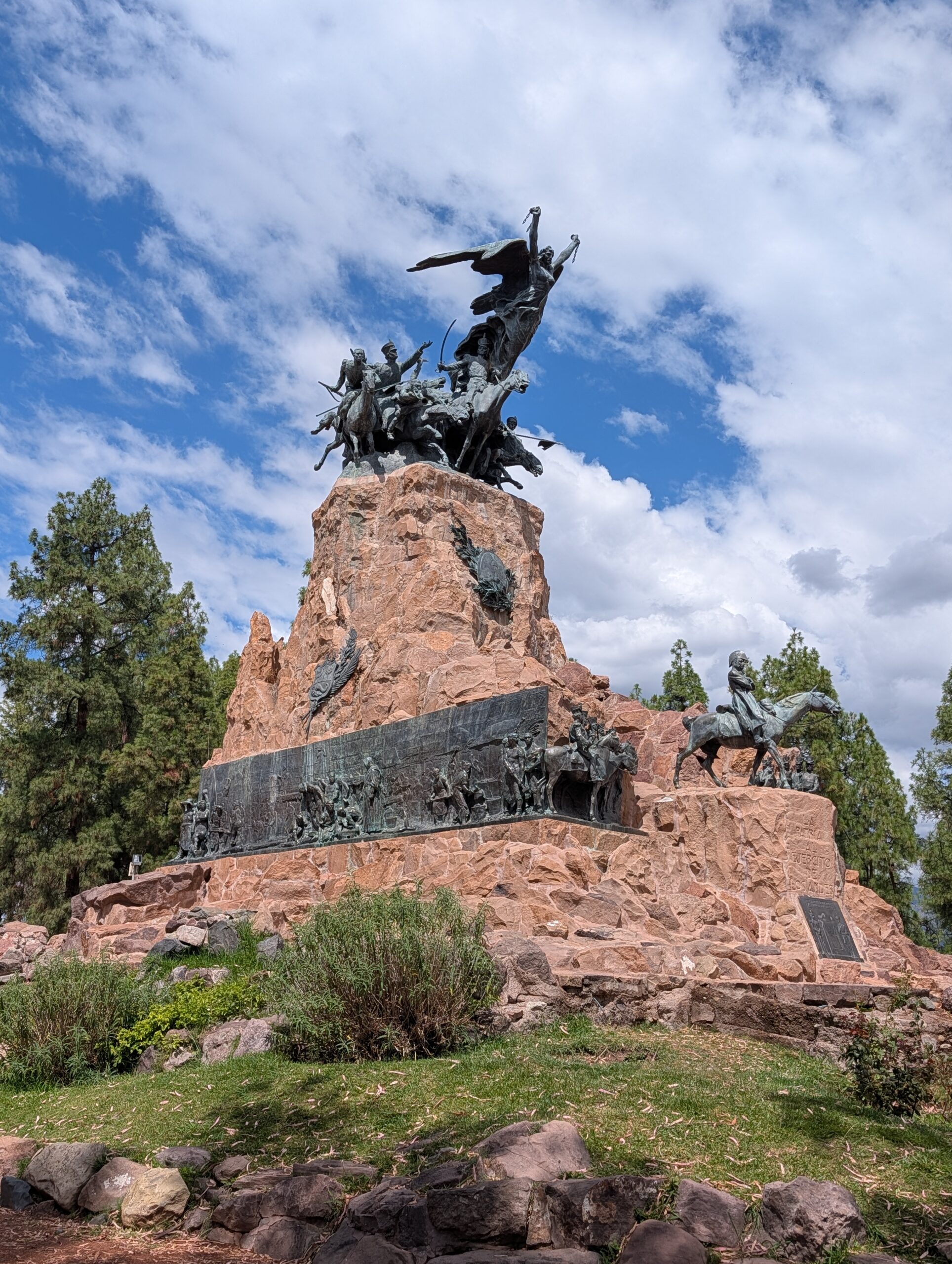 Anyway, then we saw the hill, Cerro de la Gloria. It is small in comparison to the Andes Mountains in the background, but it is the only one around here. Then we reached an “S” climb to the top. At some of the bends are signs telling how far we’ve gone up,… 15 m (49 ft); 45 m (147.6 ft); and then 65 m (213 ft). Whew!! So really all the elevation is climbing the switchback ramp at the hill!!! I was huffing and puffing, not gonna deny it! But at the top you can see all of sprawling Mendoza spread out 180 degrees to our east, and the other 180 degrees, west, is the line of marching Andes. The whole 360 degrees panorama was impressive and worth the effort of the climb. Beside the spectacular views there was an impressive monument here on top! It was titled “La Patria al Ejercito de los Andes,”  which translated as “The Patriotic Army of the Andes.” It was rather large and impressive with a metal relief around two sides and the back in addition to the large statue built on the massive boulder here. There were placards that told of the Uruguayan sculptor, Juan Manuel Ferrari, and the raising of the sculpture in 1914. Also a placard showed it was 1,000 m (3,281 ft) above sea level, not 985 (3,232)m!