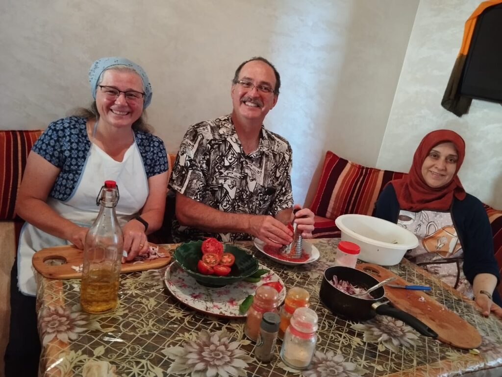 Today awoke and readied. We left around 845 to get to Marrakesh Gate of the medina. There we met Fatima, she is going to teach us about some Moroccan cooking!! That’s right we are taking a cooking class! We are joined by another woman from Tunisia. We loaded up into taxis, and headed to her local market. Arriving we were asked about what to make. We four all decided on a lamb tagine and vegetable couscous. First, we went to a vegetable/fruit stand. She got carrots, sections of cabbage, and pumpkin, eggplant, some small squash-type vegetable, turnips, some large bean pods (she did not know English name, but they were color of lima bean, size of butter beans), tomatoes, two green peppers, one red pepper, and one honeydew. Next shop, the butcher. She got a lamb shank, and some ribs; and had him chop them up, bone and all. Next place herbs. She picked out all fresh coriander (what we call cilantro), parsley, and mint. Move one to the red onions stall. She picked a bunch of these, a whole kilo=2.2 lbs! Next we went to a spice shop. Here she bought turmeric, raisins, almonds, and prunes. Lastly, we went to a pastry shop, She bought an assortment. The patisserie owner gave us all a shortbread type cookie, gratis! This is when we found out it was the Tunisian woman’s birthday!! We passed on happy greetings and explained it was my birhtday two days ago. 🙂