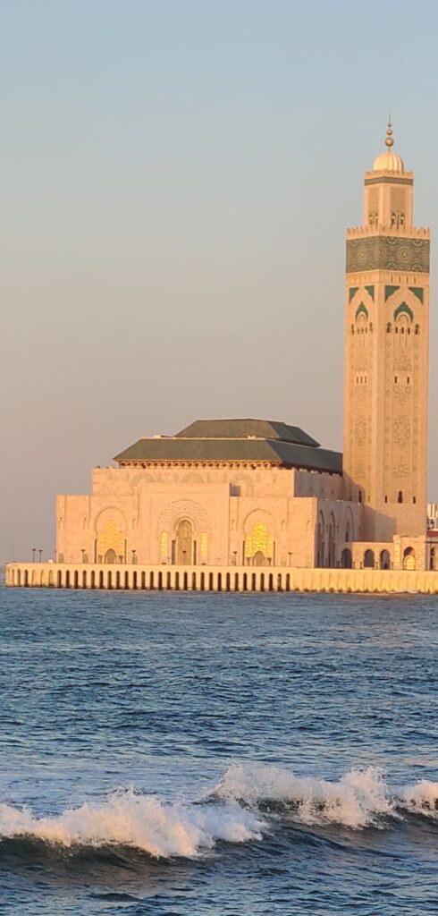 We went back out and about at 630pm. Trekked back over to the Mosque area. There is a lighthouse around it. I did not mention the Mosque was built half jutting over the ocean! During construction they actually built a huge earthen dam to hold back the water, proceeded with the foundation of Mosque, then removed the dam. Anyway, back to the lighthouse, it is around a bowl part of the shore from the Mosque. It is a pretty tall one, but not open to climb it. A guy standing there said he keeps it clean,and went into a listing of facts. There does seem to be a Fresnel lens in the top. Now we worked our way back toward the Mosque for sunset pictures. The setting sun’s rays made the gold glisten and really pop. It was– Spectacular!! Today was the King’s Birthday, so there were quite a few out enjoying as well. We reluctantly most go back to our hotel for our last night in Morocco!!