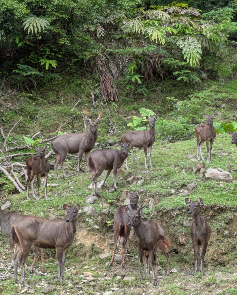After the guided walk finished, we thanked her and all went on our way. We loaded back up into our car, stopping briefly to eat a snicker-snack. We toured the Geopark site and saw the rock with a placard explaining Kinabalu Park being a UNESCO World Heritage site. We loaded up and left, deciding to check out the part of the park at Poring Hot Springs. It was a 1.5 hour drive, down past the town of Ranau. When we arrived we were able to use our same tickets for this area! Yeah!! We went to an Orchid area- hardly any orchids; found a place of animal enclosures – only seeing Sambar Deer; trekked a loop of a Tropical Garden; visited the Aviary, but it was mostly closed; and discovered the Hot Springs and the baths – there was only a slight sulfur smell. You had to pay to get into the springs. We did not have our bathing suits and we were not interested. Lastly we went to the Butterfly enclosure. We did see a few different butterflies here.