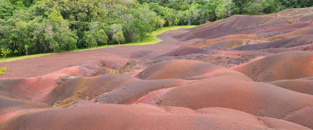 Now we drove on to Chamarel 7 Colored Earth Park. There is an entrance fee here, but it is our only one today. We drove in and went to be, well, amazed. And we were. This area is the result of volcanic activity from ions ago. First we saw Mauritius’ tallest single-drop waterfall, Chamarel Waterfalls. It is 100 meters/272 feet high. Quite striking! Next we went to a geology site (the parks main site) Seven Colored Earth. The landform was basaltic rock that eroded away and basically left what we see. This erosion stripped nutrients, so no plants grow; and left deposits of iron and aluminium oxide, which cause the red, brown, violet, green, blue, purple and yellow coloration. The iron and aluminium repel each other and cause the striping and ridges seen today. It appears like clay and is in mounding, gentle-rolling, small waves of earth. It was really neat to see and witness some of God’s display of Creation.