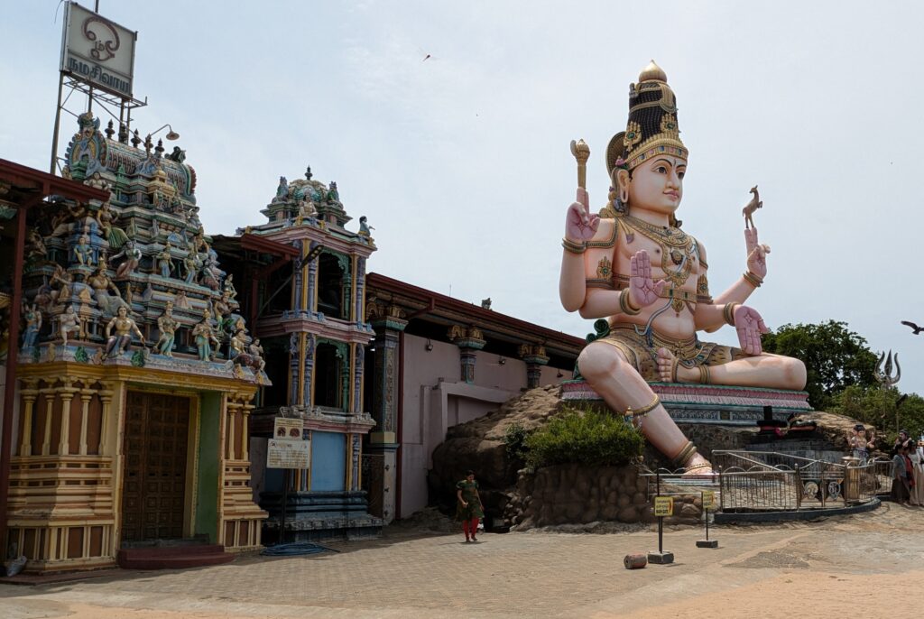 The road opened to the temple which is dominated by a huge Hindu Shiva idol statue with four arms and a tower gate entry that is decorated with so many other idol gods. These gods are all painted in a more pastel color scheme. We walk around the temple first, because the views from up here are amazing. Trincomalee is a very large natural harbor… according to Wikipedia it is the fourth largest natural harbor in the world(?). We also pass by many smaller idol station worship places, dotting around the main temple.