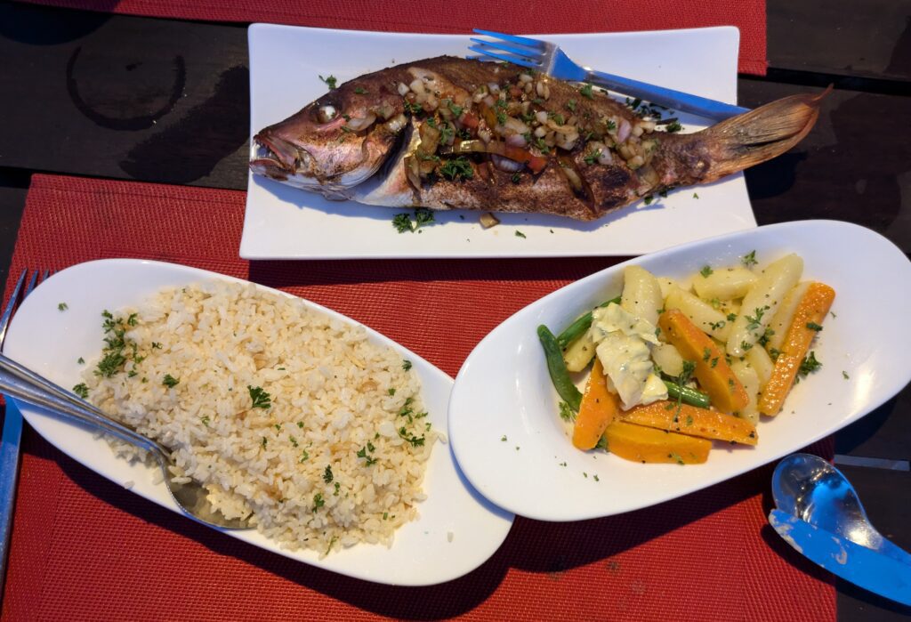 Back at our place we took a siesta and had a light snack-type lunch. Around 1800 we went back out to the beach to walk some and find a restaurant for dinner. As we were checking out one place, I found one of the largest alive tree snails I have seen. The snail was interesting but not the menu, we moved on. We walked past Poseidon Diving – where we were the day before to dive. As the crow flies and along the beach it is not that far from us, but we are getting some steps in. Turned around and came back the Poseidon crew and other locals were playing a decent game of beach volleyball. One of the crew recognized us and waved. Then right next “door” was a restaurant, Moon Isle Restaurant. We liked their menu and stayed.