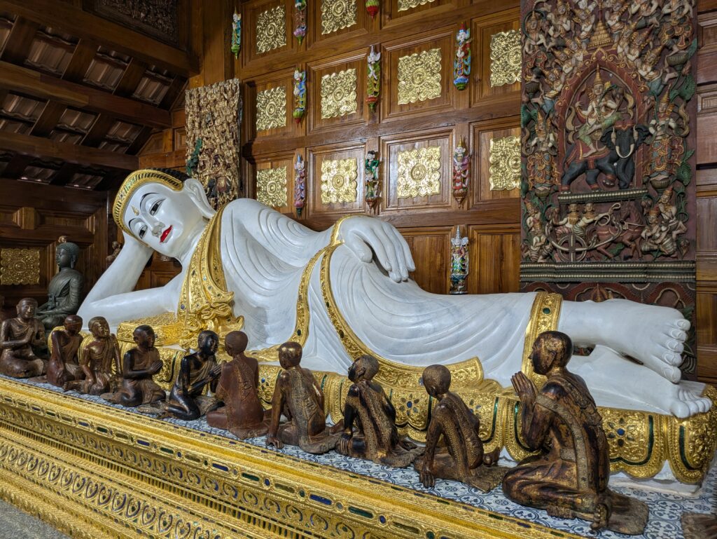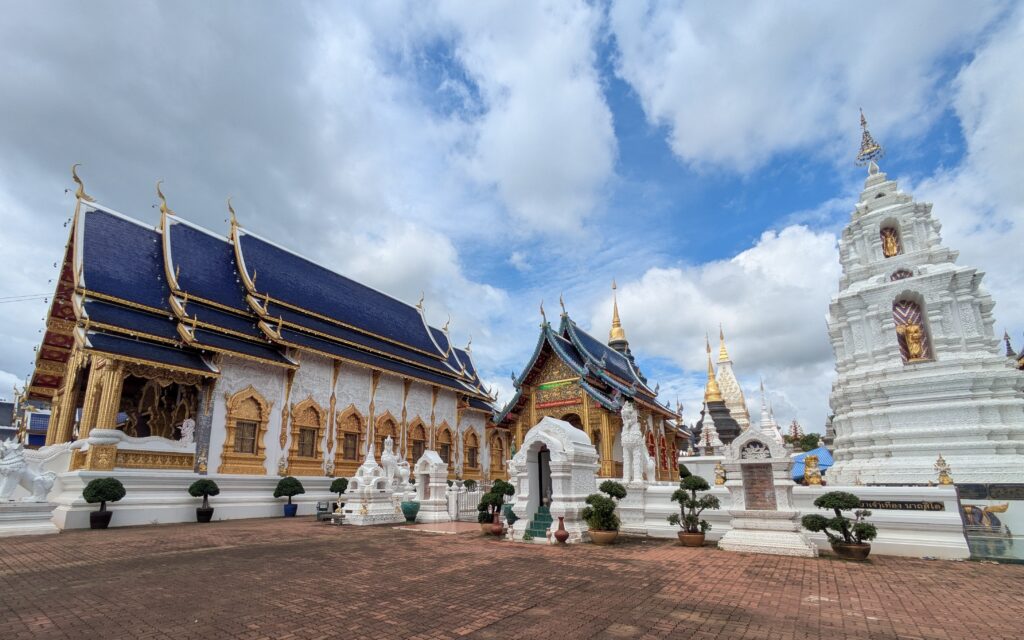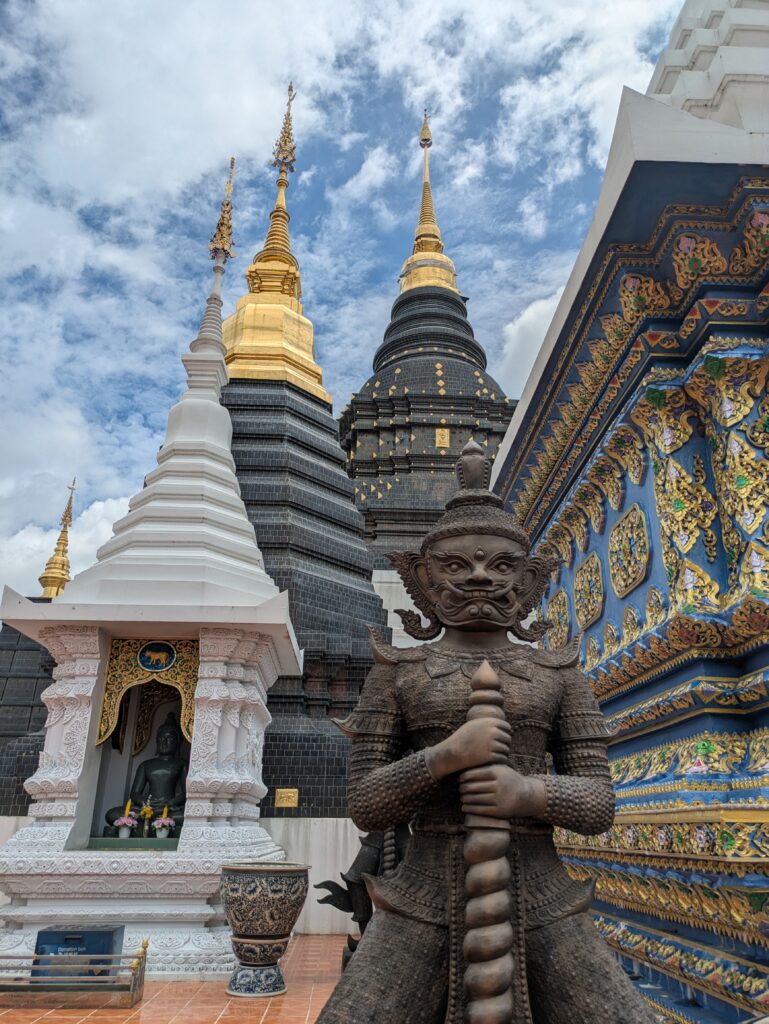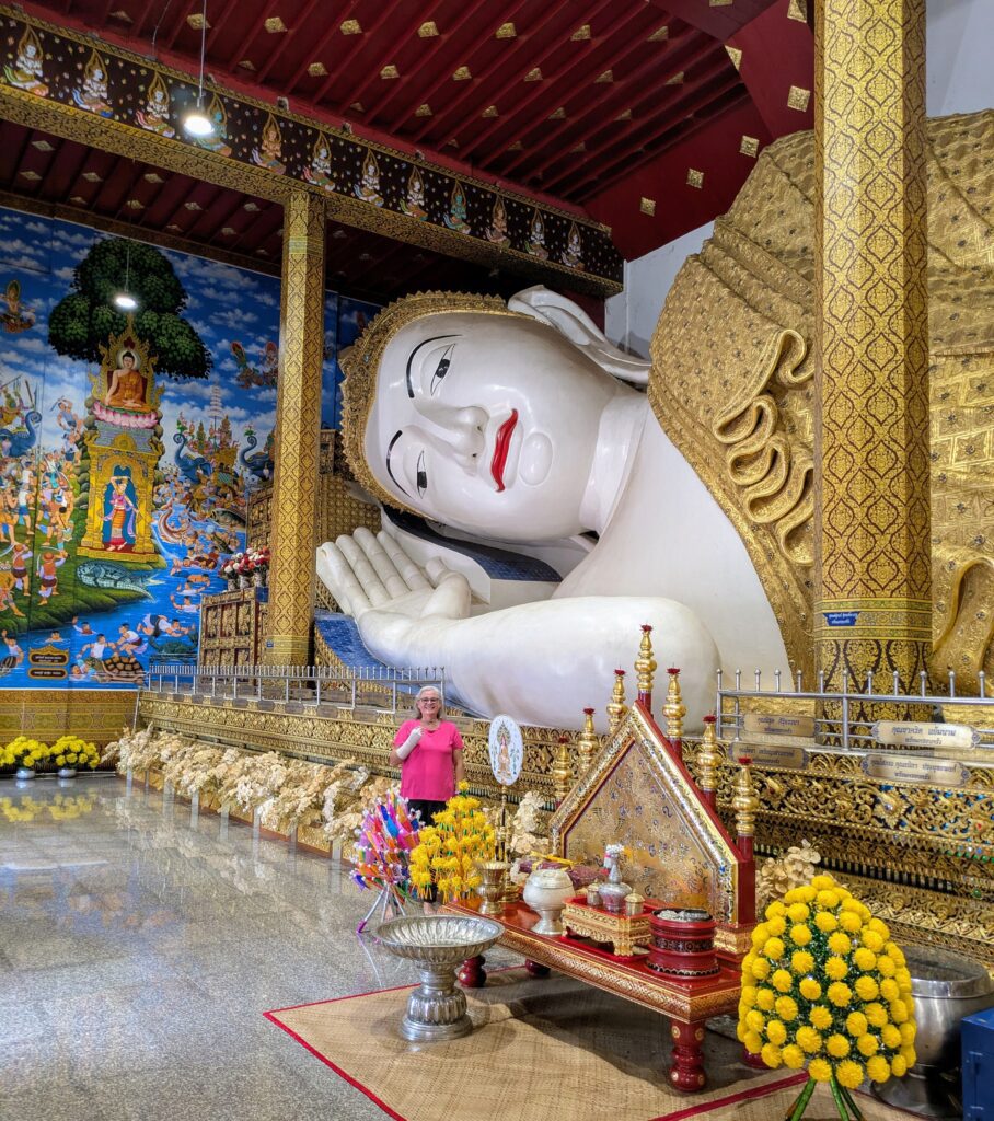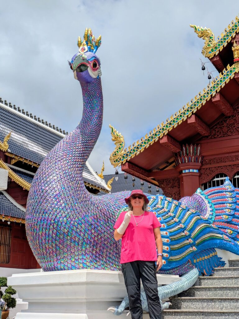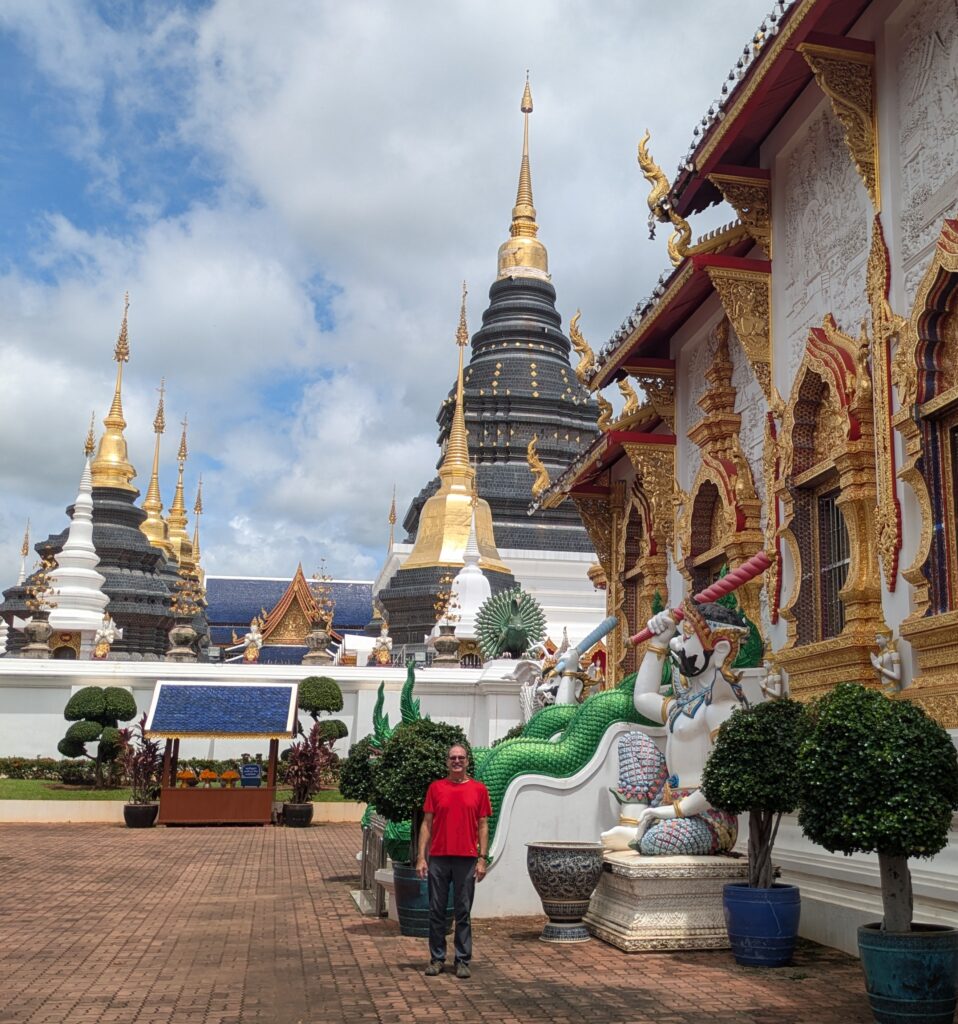 As we were leaving the town of Mae Taeng, Jeff had noticed a big Wat complex, maybe? We detoured over to it, and sure enough, it was a very large complex of many different temples. They were in the process of being constructed: the tie-in was they all had shiny, blue tiled roofs. We could hear some hammering from workers, but it was not distracting. The temples seemed to go on and on, all lined up in a row – each having their own characteristics and differing Buddhas inside them. Some of the temples that were still under construction still had plastic on the various statues, inside and outside. They were all so elaborate and highly decorated. At some point Jeff and I questioned all the money being spent on all the Wats in Thailand. Jeff had read that even some Buddhists are questioning all of these expenses as well. Anyway, we could have spent the whole morning exploring, but we loaded up and moved on.