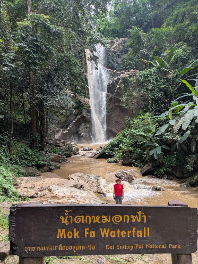 We came up on a point of interest – the Mok Fa Waterfall. We pulled in, parked and paid the fees for Jeff & I with the car – total was 230 THB, which was $7.01. The weather was nice and it was a short little hike back to the waterfall, on a decent trail of 350 m (1,148 feet). We even had the view to ourselves for a bit. It was a fairly tall spill down into a pool of muddy water, but still great to see. The power of waterfalls still amazes me!