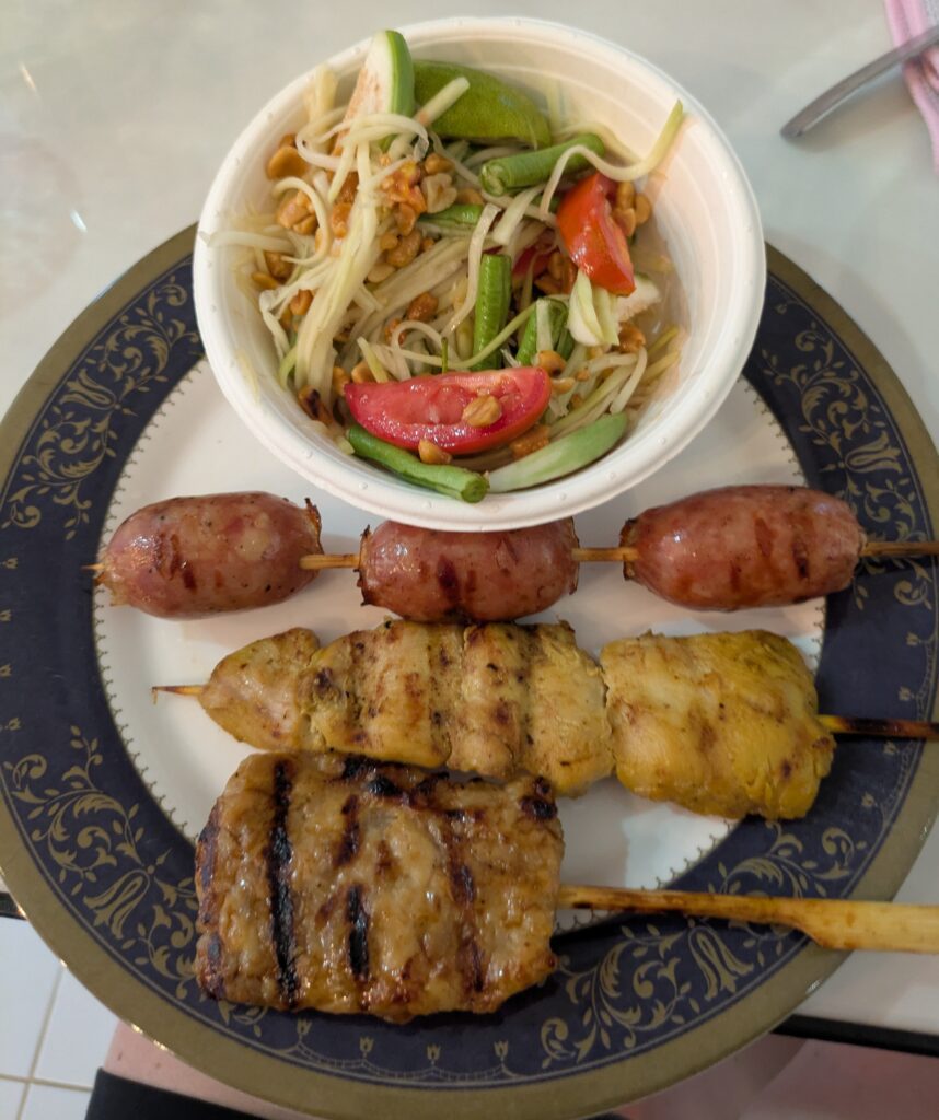 Anyway, rest of the day was mostly planning. We did make up our egg potato dish for lunch. The replacement electric plate worked great! For supper we walked over to the walking street, about ¾ of a mile from us. We found mango sticky rice for 40 THB. Then we bought a papaya salad for 30 THB. Lastly we found meat! (caveman emoji) We bought six pieces, amounting to four kinds of meat on sticks: two kinds of sausages- one was spicy; two skewered pork; and two skewered chicken- without the bones… most times the bones are there. Just saying – it’s a thing! We watched a movie then bed… A day living, just someplace else.