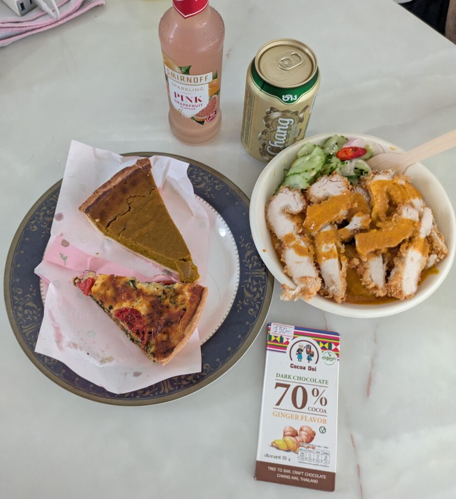 We were almost back when we discovered – about 100 m away from our place – a Saturday Market at a little park. He let me off and I explored the area for food as he took the car back. He met me, and I knew what I wanted. He agreed. We bought a Tomato-spinach Quiche, and a piece of Pumpkin Pie for 110 THB ($3.36). We went further and found a Fried Chicken Yellow Curry with potato and a spicy hot cucumber salad for anther 80 THB ($2.44). Taking these back, we had them for lunch. Yummy! For supper we had a Mushroom Cheese Puri from Barbari Bakery and a Green Tea Salad from Free Bird Cafe, as we had enjoyed these immensely the first time around. Tomorrow we leave Pai.
