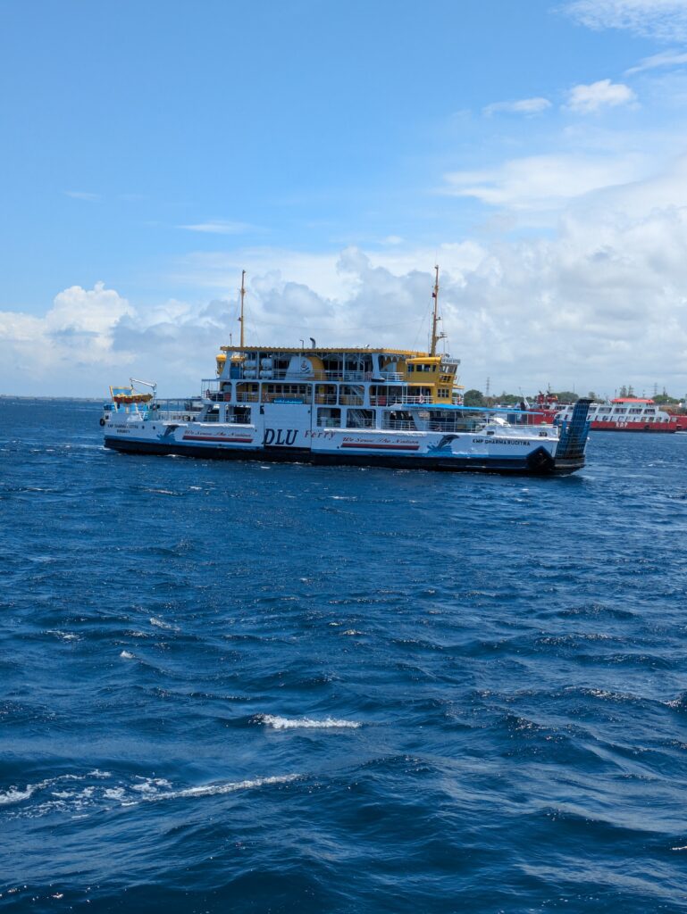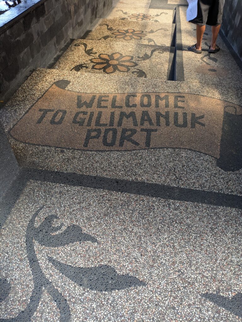 On our way to Gilimanuk to catch the ferry, we saw scooters loaded with hay as before. But something was different. There was a passenger sitting atop the hay! Reminded me in a way of Granny Clampett from Beverly Hillbillies on a rocking chair in the back of their vehicle. It was funny looking, but wowza dangerous looking! Anyway we arrived at the town. Jeff bought us ferry tickets at a booth for 40,000 IDR or only $2.41. She told us we could catch any ferry, and where to park. So we parked and went into the Gilimanuk Port by way of the walking passenger signs. The entry into the port was tiled with a saying “Welcome to Gilimanuk Port.”