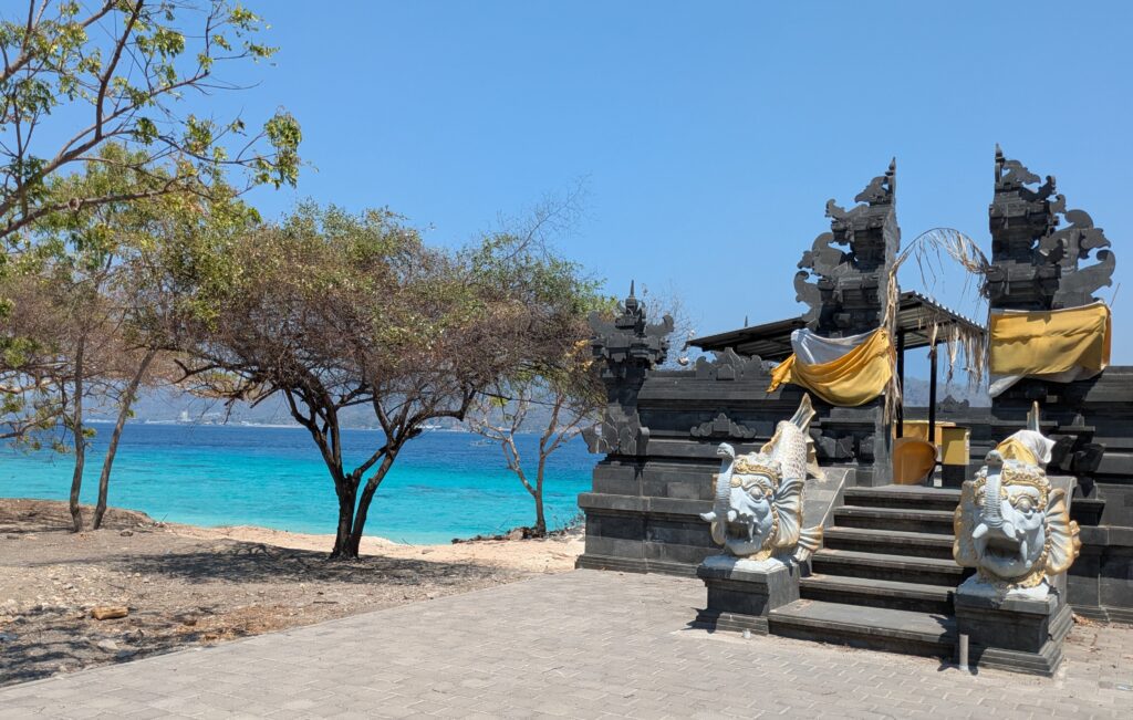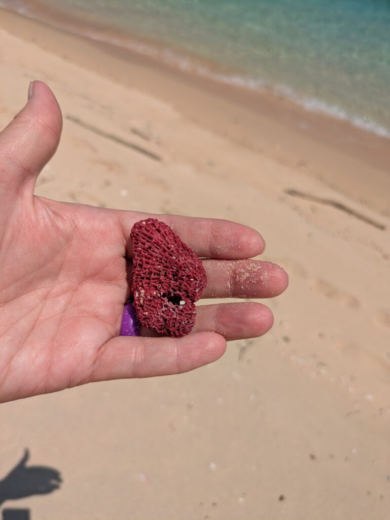 We got out at the northernmost point, seeing many Common Iora birds, a White Shouldered Triller, and more Small Minivets, with one being a male. He’s orange and flashy. We walked on the beach a bit here. Yonto picked up a piece of coral and showed us. It was almost a berry, burgundy color. He took some pictures of us with Java Island in the background. There was a smokey-haze in the air, unfortunately. Yonto said he’s from Java and pointed out the active versus the inactive volcanoes there. Then we loaded up and turned to go back.