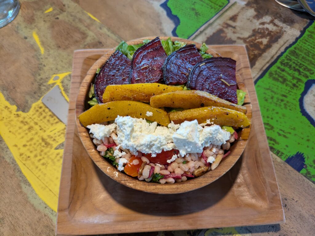 We did not have any plans today, so we just hung out watching some YouTube (quietly) and listening to music. It was another hot day, getting to 93F, but feels like 97F. For lunch we went back to The Sage Restaurant. I had a Farmer’s Choice Bowl, which consisted of Pearl Barley, Leafy Greens, Spring Onions, Tomatoes, Parsley, Grilled Beetroot (I still don’t like), Roasted Pumpkin, Feta, Toasted Sunflower Seeds with a Red Wine Vinegar-Honey Dressing; and Sparkling Sage drink. Jeff had a Baguette Sandwich, called Fishing for Compliments. It had Marinated Grilled Seasonal Fish, Grilled Capsicum, Crispy Capers, Sambal, Romaine, and Cucumbers with an Aioli sauce; and a Singaraja beer. The meal was light enough that we made it to dessert! We shared Just Another Lemon Tree… it was a piece of fantastic lemon cake! The bill came to just over 250,000 – Jeff gave 280,000 IDR, which is $16.72.