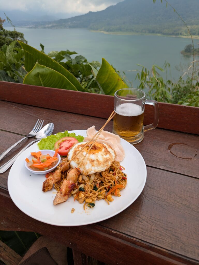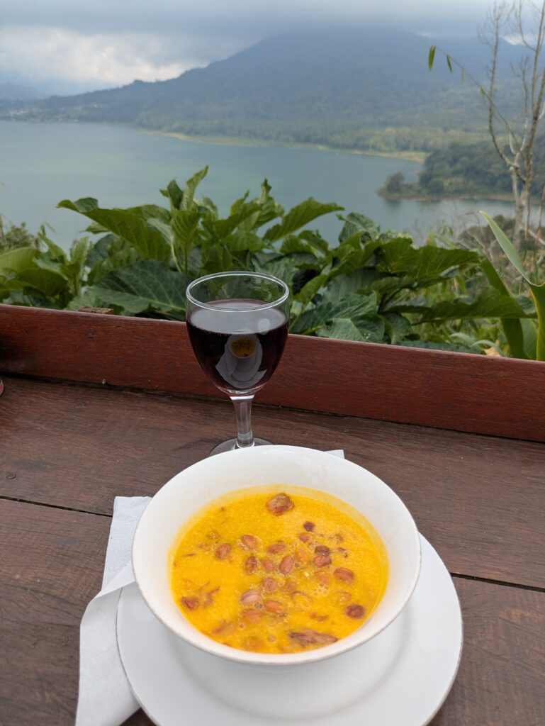 We arrived at 1345 just before our check in time of 1400, but our room was ready. The receptionist tried to put us in a different room than we had booked, but Jeff stood his ground. The room has a balcony that allows a view of one of the lakes – Danau Buyan. It is very lovely. We unloaded and had lunch at the restaurant. Our place is called The Garuda. The restaurant has seating across the street – overlooking the lake. We ate there! What an awesome view!! We had a Pumpkin Soup- pumpkin with spices, coconut milk and peanuts; a Bruschetta Alfungi- slice baguette with mushrooms, mozzarella, and tomato sauce side; and Bakmie Goreng ala Garuda- fried noodle with pickled veggie mix, fried egg, chicken sate, and prawn crackers. I had a coke and a Hatten red wine; Jeff had a Bintang beer. Bill was 297,000 IDR, Jeff gave 300,000 or $17.97. We finished and went up to our balcony… until it rained! We went inside. I blogged, Jeff read and had a siesta!