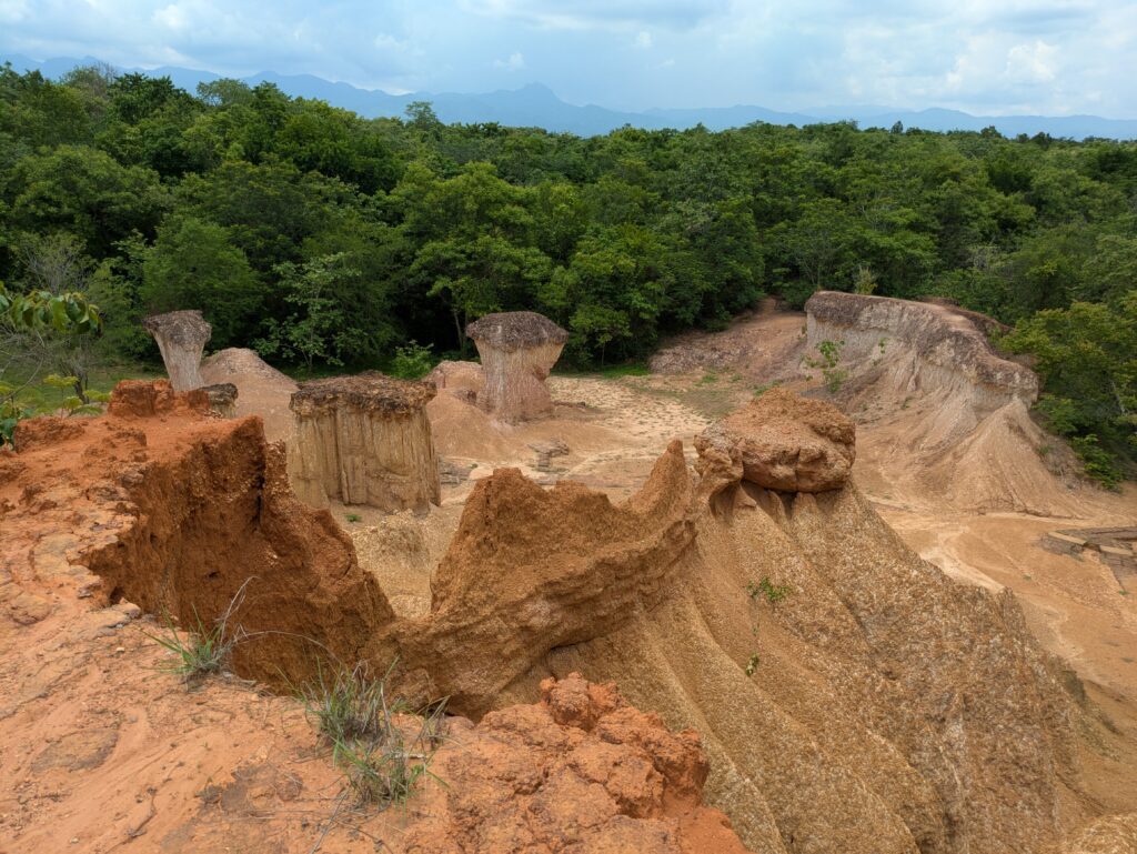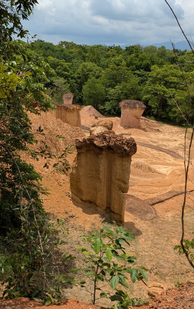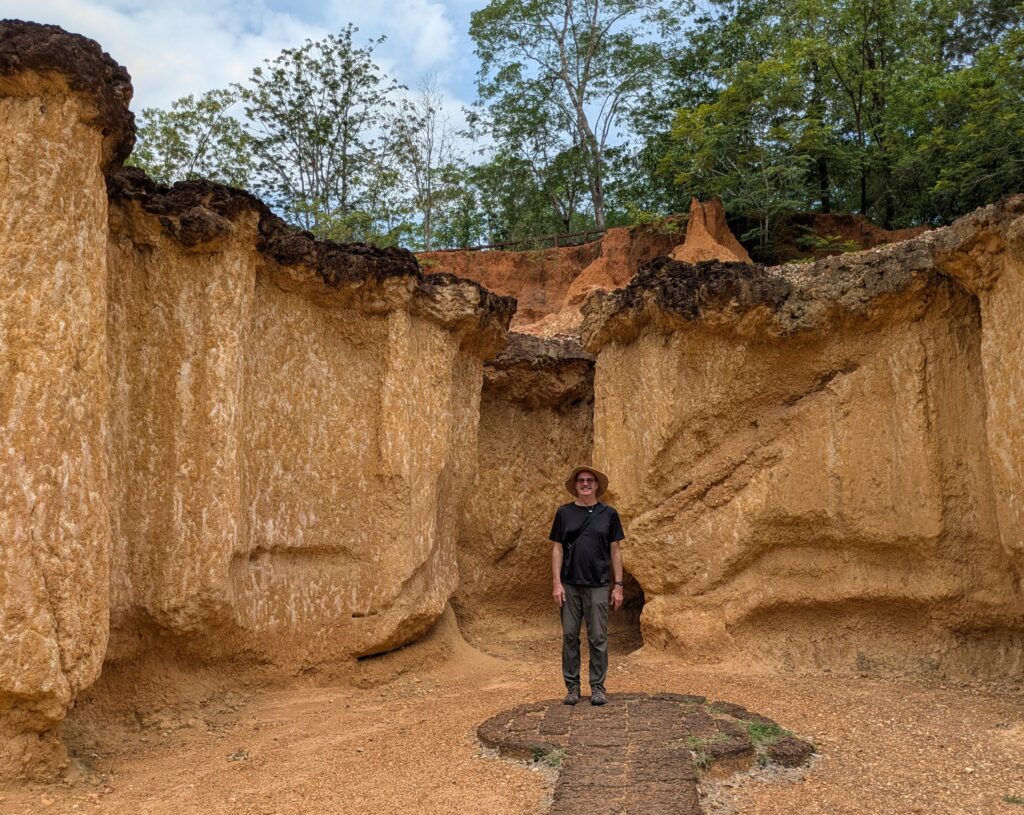 We arrived at our first destination, Phae Mueang Phi Forest Park. We paid the entrance fee of 100 THB each for foreigners (there was supposed to be a fee for our car but we weren’t charged it). The wonder in this park is the “Sao-Din or posts of soil” caused by water/rain and wind eroding some parts of the soil, more than other parts – according to placards as we enter. Then we arrived to the attraction or what is left. Columns or other shapes of naturally carved sandstone with toppers of dark brown or black colored edging. In a way they reminded us of Bryce Canyon’s Hoodoos. The placards (paraphrased) tell about a local legend. Of a lady foraging for food in the forest and coming upon gold and silver. She loaded up some on a rail, but angels protecting the bounty disoriented her, making her lost. So she had to leave the bounty and then was only able to get back to her village. She told her story and some villagers tried to find her left bounty, but instead only found her footprints that lead to a coffin, not the bounty. So the place was named “Phae”- meaning forest, and “Mueang Phi”- meaning City of Ghosts. Anyway, the area of these natural formations was quite small – 30 meters wide by 100 meters long, or 98” X 328” – and very unique, but we didn’t see any gold or silver or ghosts!😂🤣 It is open to walk all around them, and the only signage around here, reads: Do not climb. It surprised us that any formations still remained because of how crumbly the sandstone was. Then we could see in the banks surrounding how the pillars may come about and evolve over time. It was interesting.