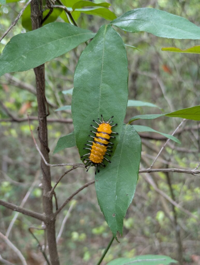 We walked all about the unusual sandstone pillars and then hiked along a trail that was elevated around the formations and lead us through some forest back to our car. Along the trail there were placards describing the park and flora/fauna in it. We were hoping to see some wildlife, but all we saw was some yellow-orange caterpillars with three black stripes, a couple of black gecko-type lizards, and of course spiderwebs – without their spider makers, thankfully. We made it to the entrance/main parking area and tried to see the Exhibition Center but it was closed, so we left the national park and went on to our next stop.