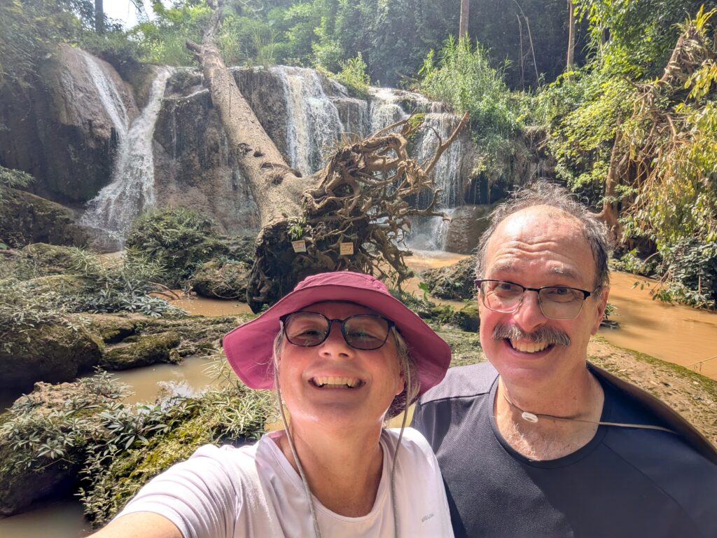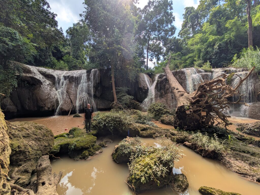 Anyway now we walked the easy trail to the awaited waterfall and were rewarded for our perseverance. It was a glorious waterfall, maybe a twenty foot drop in a way wider ark that has been separated into two distinct section by vegetation growing up on the ledge. There was also a huge dead tree that has fallen onto that ledge and will just have to naturally be broken down, because of it’s sheer size. Anyway, we had the place to ourselves for a good ten minutes and got our pictures. The water is supposed to be emerald green, but it is a very brown muddy color, due to it being rainy season and carrying dirt run-off from higher up the river. You can swim here, but we weren’t interested in a mud bath!🤣