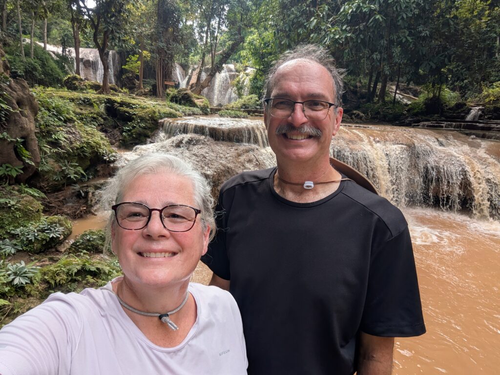 We resumed to the waterfall we had first planned to go to. It was way more promising. It had an actual road all the way to a fee booth and a parking area. We paid the 100 THB each ($3.06 each) and 30 THB for the car ($0.92) to enter Than Sawan Waterfall. While Jeff was waiting for them to make change, I got out and noticed a really cool tree, a Sompong Tree. I only saw it because it was cool! Twisted roots that branched up almost six feet to then form the actual tree. I took a picture of the placard without reading it, but Jeff came over and read it. At the bottom of the sign it read: “Believed that…husband and wife or teenagers love each other when hold hand and walk together under the Sompong tree will be a partner stay happy forever.” So he grabbed my hand and we walked under it! How romantic is that!!