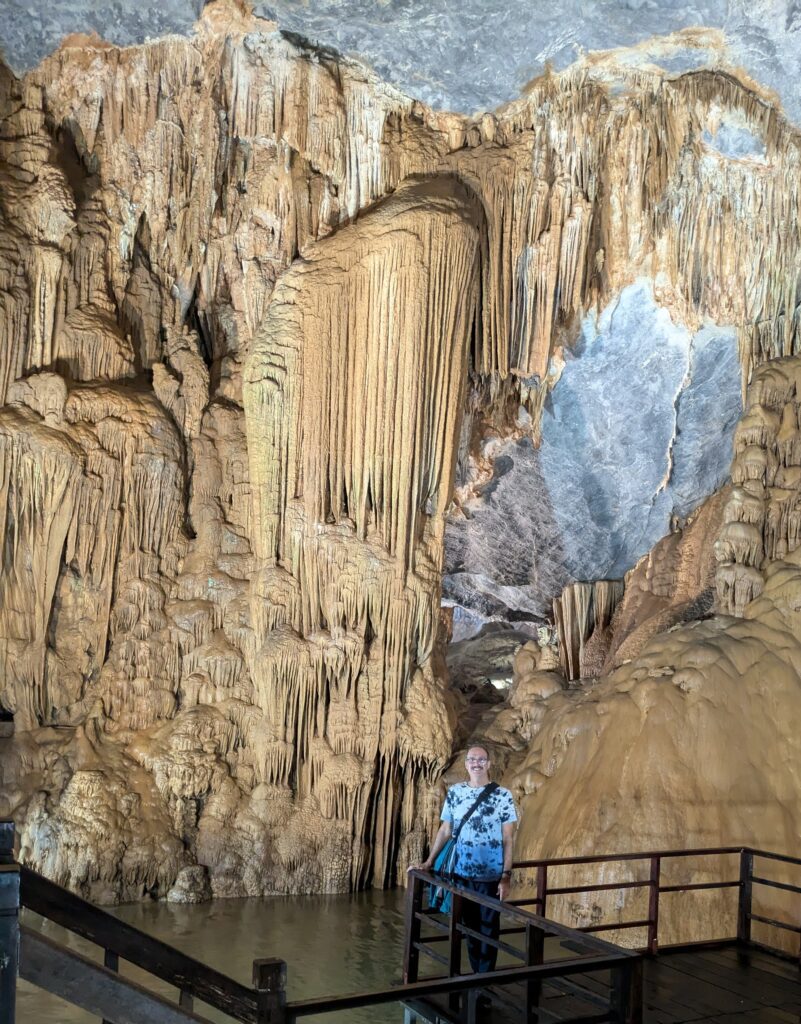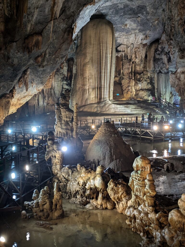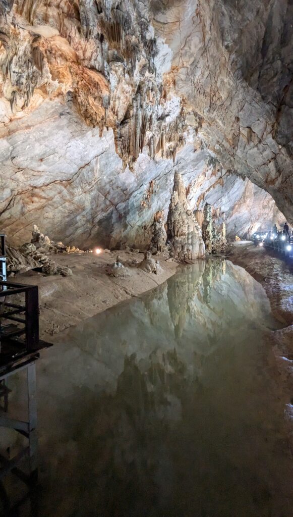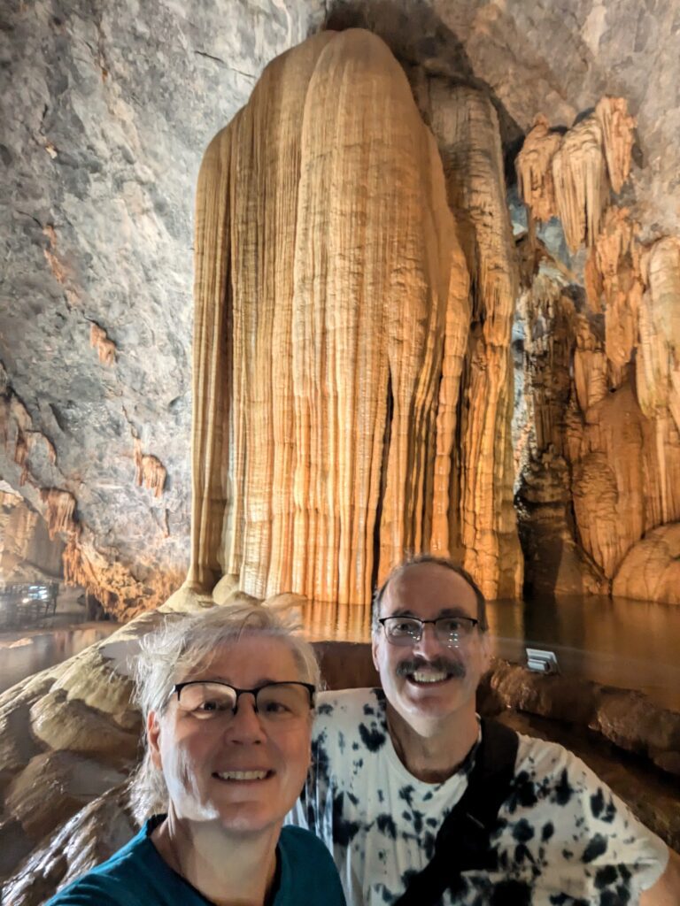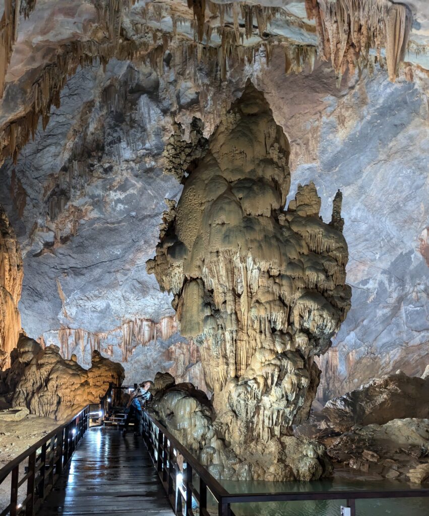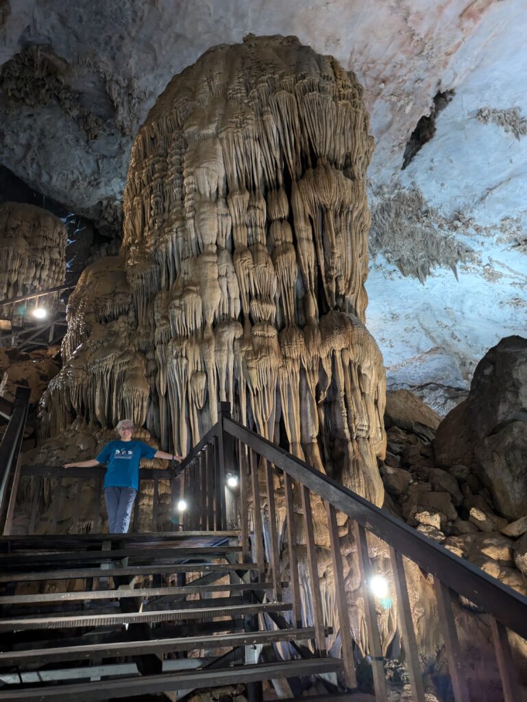 We arrived at Paradise Cave by 0930. We were directed to parking, which cost 5,000 Dong (20 cents). We went to the ticket booth – admission was 265,000 Dong each ($10.44). This included an electric buggy ride, that was not negotiable. The slogan of Paradise Cave –Palace Inside the Karst. I thought it was a great slogan with a picture of a mountain hollowed out with cave stalagmite formations enveloped in the hollow place. Anyway, we boarded the electric buggy and were taken 1.6km – basically one mile – to the 523 steps up to the entrance. (Actually, they have you take a ramp up and the steps down.) At the entrance is a restroom and an area to regroup before entering. We drank some water and caught our breathe, then entered.